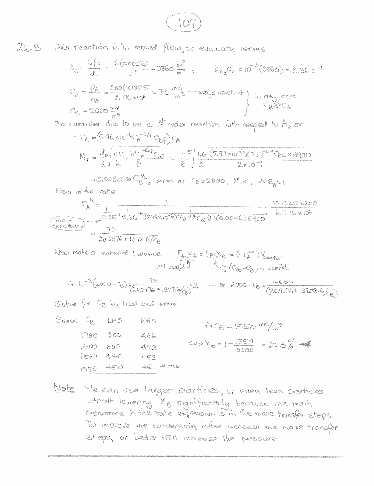 107 22.3 This reaction is in mixed flow, so evaluate terms = 6fs dp 6(0.0056) 10-5 = 3360 m² ac = (3360) = 3.36 CA = PA MA = 200/101325 2.776x105 = 73 mol m3 stays constant in any case CA CB = 2000 m3 So consider this to be a 1st order reaction with respect to or CA MT = dp 6 2 = 2x109 = even at CB = EA=1 Now to the rate 101325x200 0.05 + 3.36 + 2.776 105 main 73 + Now make a material balance = FBOXB Vreactor not useful useful. = 73 or 2000 14600 = Solve for CB by and error Guess CB RHS CB = 1550 1700 300 466 1400 600 433 and = 1550 2000 = 22.5% 1560 440 452 1550 450 451 OK Note We can use larger particles, or even less particles without lowering significantly because the main resistance in the rate expression is in the mass transfer steps. To improve the conversion either increase the mass transfer steps, or better still increase the pressure.