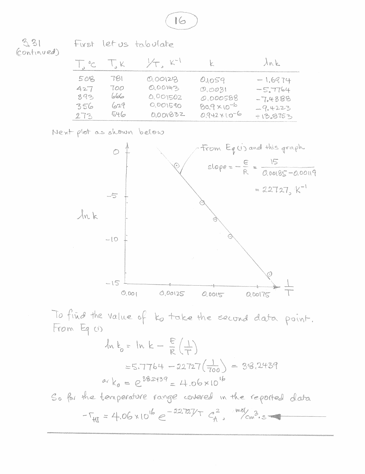 16 3.31 First letus tabulate (continued) T,K k Ink 508 181 0.1059 - 1.6974 427 700 0.00143 0.0031 -5.7764 393 666 0.001502 -7.4388 356 629 0.001590 -9.4223 273 546 0.001832 Next plot as shown below From this graph slope = E = 15 R = 22727, Ink -10 -15 0.001 0,00125 0.0015 0,00175 T To find the value of ko take the second data point. From Eq (i) = E R (+) = =5.7764 22727 = 38,2439 = = So for the temperature range covered in the reported data = e - 22727/T 2