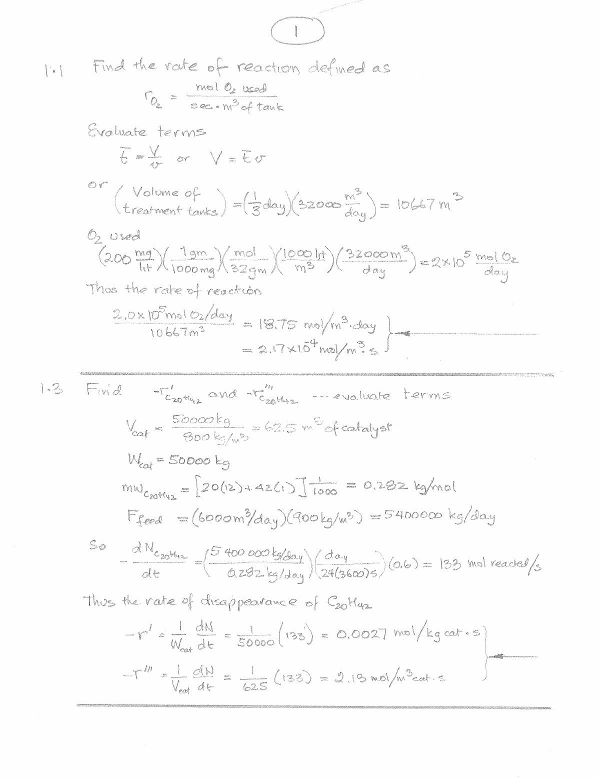 1.1 Find the rate of reaction defined as mol used = sec. m3 of tank Evaluate terms E = V or V = 5 or treatment Volume of tanks) = day)(32000 day m3 ) = 10667 used (200 mg lit 1000mg 1gm 32gm day = mol day Oz Thus the rate of reaction 02/day = 18.75 day 10667m3 = 2.17 1.3 Find -r' and evaluate terms = 50000kg 800 kg/m3 = 62.5 of catalyst = 50000 kg = [20(12) + 42(1) J 1000 = 0.282 kg/mol Ffeed = = 5400000 kg/day So dt = 5 400 000 24(3600)s day ) (0.6) = 133 mol reacted/s Thus the rate of disappearance of = Weat dN dt = 50000 (133) = 0,0027 cat. = Veat dN = 62.5 (133) = 2.13