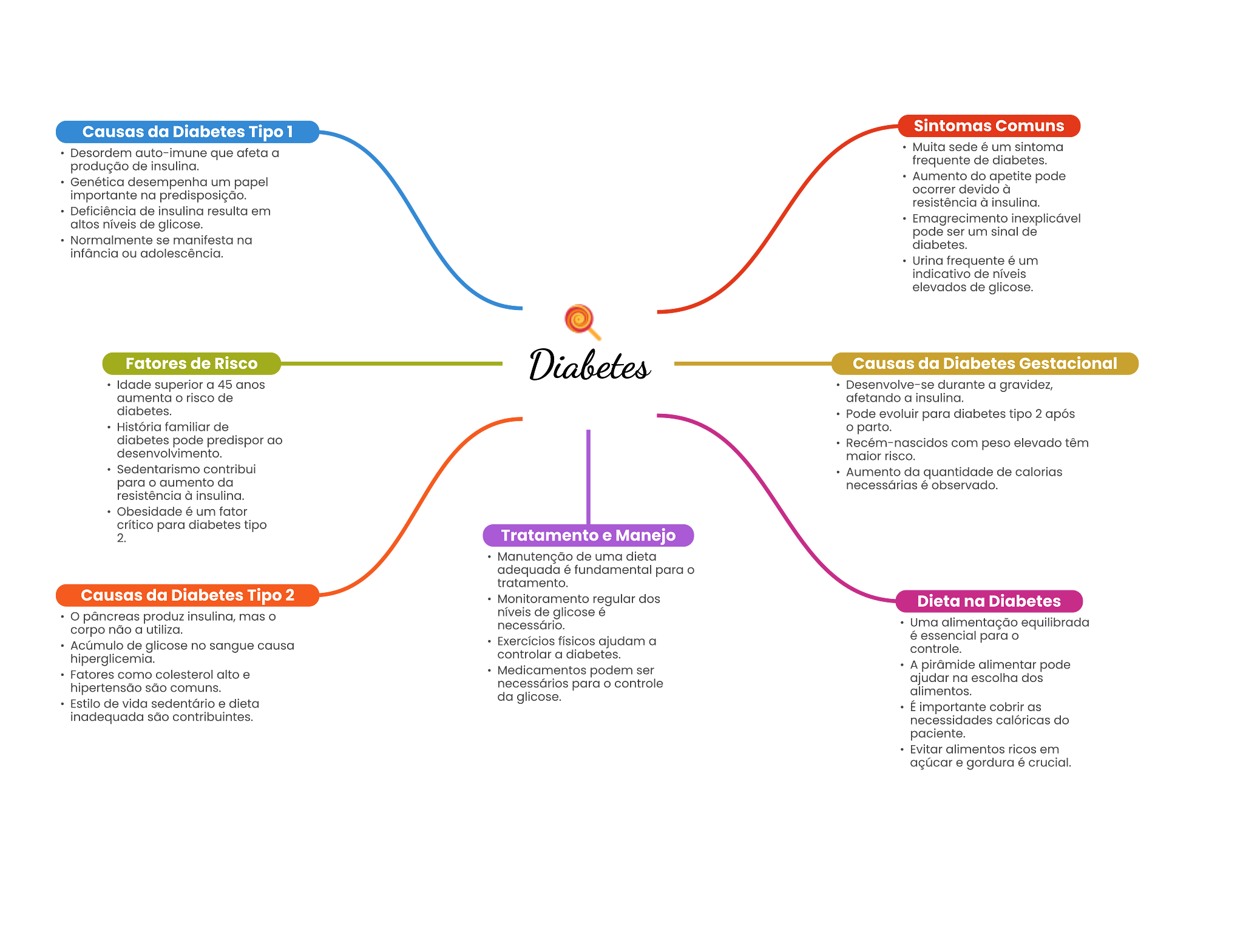 Causas da Diabetes Tipo 1 Sintomas Comuns Desordem que afeta a Multa sede um sintoma produção de frequente de desempenha um papel Aumento do pode na ocorrer devido à a Deficiência de resulta em de glicose. pode ser um de Normalmente manifesta na diabetes. ou Urina frequente é um indicativo de nivels elevados de glicose. Fatores de Risco Causas da Diabetes Gestacional superior a 45 anos Desenvolve-se durante a gravidez, risco de afetando a Pode evoluir para diabetes tipo 2 após História familiar de parto. diabetes pode predispor com paso elevado têm risoo. Sedentarismo Aumento da quantidade de calorias para o da observado. à é um fator para diabetes tipo 2. Tratamento e Manejo Manutenção de uma é fundamental para tratamento. Causas da Diabetes Tipo 2 Monitoramento regular dos Dieta na Diabetes pâncreas produz mas de glicose corpo não utiliza. necessário. Uma equilibrada Acúmulo de glicose no sangue causa ajudam a essencial para controlar a controle. podem ser A pirâmide alimentar pode Fatores como alto para controle ajudar na escolha dos hipertensão comune. Estilo de vida dieta da glicose. alimentos. É cobrir as são contribuintes. calóricas do alimentos ricos em açúcar