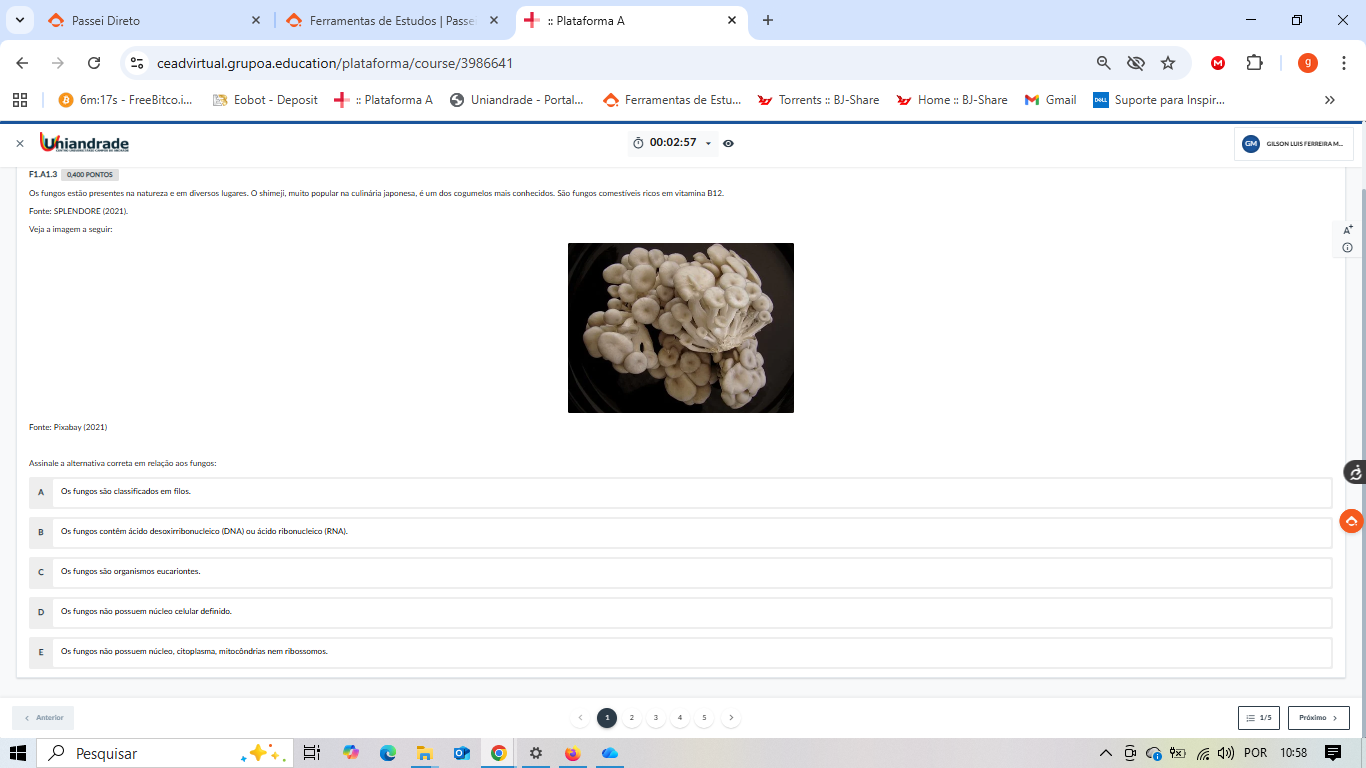 Passei Direto X Ferramentas de Estudos Passe + Plataforma A + X ceadvirtual.grupoa.education/plataforma/course/3986641 0 g : 6m:17s Eobot Deposit Plataforma A Uniandrade Portal... Ferramentas de Estu... Torrents BJ-Share Home BJ-Share M Gmail Suporte para Inspir... X Uniandrade 00:02:57 GM GILSON LUIS FERREIRA F1.A1.3 PONTOS Os fungos estão presentes na natureza e em diversos lugares. shimeji, muito popular na culinária japonesa, é um dos cogumelos mais conhecidos São fungos ricos vitamina Fonte: SPLENDORE (2021). Veja imagem seguir: Fonte: Pixabay (2021) Assinale a alternativa correta em relação aos fungos: A Os fungos são classificados em filos. B Os fungos contém ácido (DNA) ou ácido ribonucleico (RNA). C Os fungos são organismos eucariontes. D Os fungos não possuem núcleo celular definido. E Os fungos não possuem núcleo, mitocondrias nem Anterior 1/5 Pesquisar POR 10:58