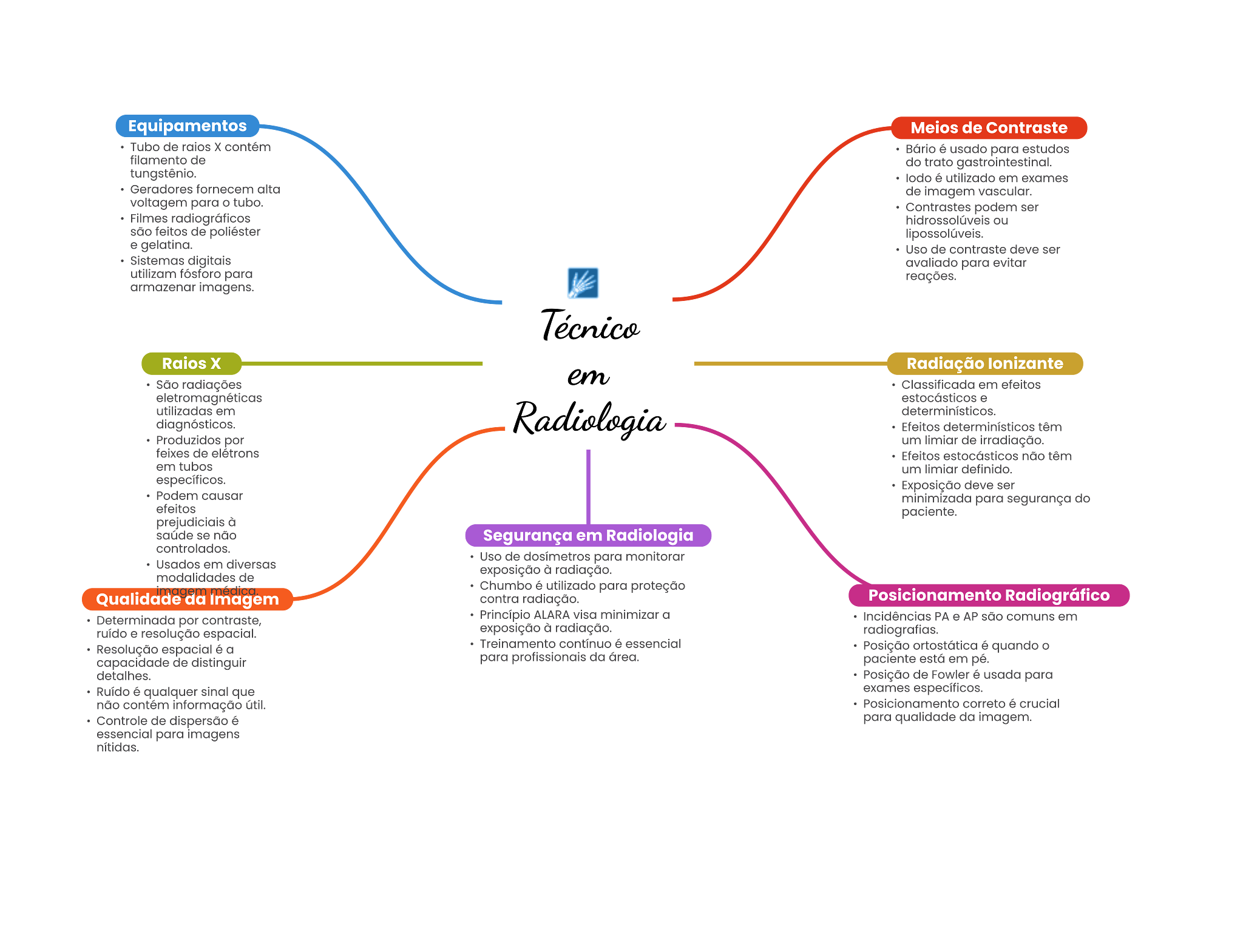 Equipamentos Meios de Contraste Tubo de contém Bário usado para estudos de do trato lodo utilizado em exames Geradores de Imagem vascular. voltagem para tubo. Contrastes podem ser radiográficos ou feitos de gelatina. Uso de contraste deve ser digitale avaliado para evitar utilizam fósforo para Raios Radiação São radiações em efeitos em diagnósticos. Efeitos Produzidos por um limiar de de Efeitos não têm em tubos um limiar definido. Exposição ser Podem causar para segurança do efeitos paciente. prejudicials à não Segurança em Radiologia controlados. Usados em Uso de para monitorar de exposição à radiação. imagem médica Chumbo é utilizado para proteção Qualidade da Imagem contra radiação. Posicionamento Radiográfico Determinada por Principio ALARA visa minimizar PA AP são comune em . resolução espacial. exposição radiação. Resolução a Treinamento contínuo quando capacidade de distinguir para da está em detalhes. Posição de Fowler usada para Ruído é qualquer que não contém Informação Posicionamento correto crucial Controle de dispersão para qualidade da essencial para Imagens