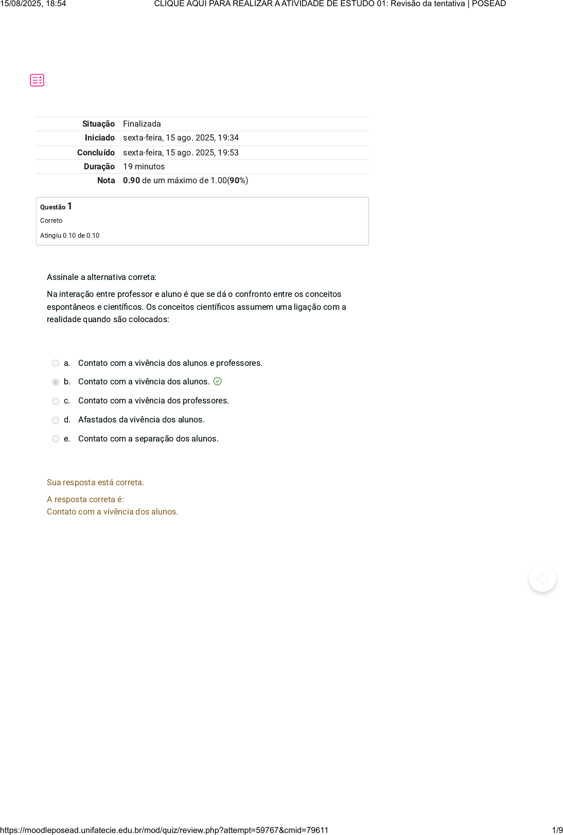 Situação Finalizada Iniciado sexta-feira, 15 ago. 2025, 19:34 Concluído sexta-feira, 15 ago. 2025, 19:53 Duração 19 minutos Nota 0.90 de um máximo de 1.00(90%) Questão 1 Correto Atingiu 0.10 de 0.10 Assinale a alternativa correta: Na interação entre professor e aluno é que se dá o confronto entre os conceitos espontâneos e científicos. Os conceitos científicos assumem uma ligação com a realidade quando são colocados: a. Contato com a vivência dos alunos e professores. b. Contato com a vivência dos alunos. c. Contato com a vivência dos professores. d. Afastados da vivência dos alunos. e. Contato com a separação dos alunos. Sua resposta está correta. A resposta correta é: Contato com a vivência dos alunos. 15/08/2025, 18:54 CLIQUE AQUI PARA REALIZAR A ATIVIDADE DE ESTUDO 01: Revisão da tentativa | POSEAD https://moodleposead.unifatecie.edu.br/mod/quiz/review.php?attempt=59767&cmid=79611 1/9 Questão 2 Correto Atingiu 0.10 de 0.10 Ao percorrermos parte dos processos de instrução, podemos notar que o ensino não é apenas mera transmissão de informações. Trata-se, na realidade, de um trabalho de mediação entre os conhecimentos atuais do aluno e as novas matérias do ensino. Essa mediação é realizada pelo: a. Professor que, mesmo não conhecendo todos os conteúdos, é capaz de organizar a atividade de estudo dos alunos, tornando o processo mais eficaz. b. Professor que, conhecendo mais profundamente os conteúdos, é capaz de organizar a atividade de estudo dos alunos, tornando o processo menos eficaz. c. Orientador que, conhecendo mais profundamente os conteúdos, é capaz de organizar a atividade de estudo dos alunos, tornando o processo mais eficaz. d. Professor que, conhecendo mais profundamente os conteúdos, mesmo assim não é capaz de organizar a atividade de estudo dos alunos, tornando o processo mais eficaz. e. Professor que, conhecendo mais profundamente os conteúdos, é capaz de organizar a atividade de estudo dos alunos, tornando o processo mais eficaz. Sua resposta está correta. A resposta correta é: Professor que, conhecendo mais profundamente os conteúdos, é capaz de organizar a atividade de estudo dos alunos, tornando o processo mais eficaz. 15/08/2025, 18:54 CLIQUE AQUI PARA REALIZAR A ATIVIDADE DE ESTUDO 01: Revisão da tentativa | POSEAD https://moodleposead.unifatecie.edu.br/mod/quiz/review.php?attempt=59767&cmid=79611 2/9 Questão 3 Correto Atingiu 0.10 de 0.10 Na segunda metade do século XVIII houve a expulsão dos Jesuítas que na época haviam instituído colégios e seminários no Brasil, com a expansão das indústrias, as mudanças sociais e políticas se fizeram necessárias. Por que Marquês de Pombal realizou a proibição do Ensino Jesuítico? a. Acreditava ser uma ameaça ao seu governo e reformas políticas. b. Nenhum momento era uma ameaça ao seu governo e reformas políticas. c. Acreditava ser uma ameaça ao seu governo e reformas no Ensino d. Acreditava ser uma ameaça ao seu governo espanhol e às reformas políticas. e. Acreditava ser uma ameaça aos Jesuítas e às reformas políticas. Sua resposta está correta. A resposta correta é: Acreditava ser uma ameaça ao seu governo e reformas políticas. 15/08/2025, 18:54 CLIQUE AQUI PARA REALIZAR A ATIVIDADE DE ESTUDO 01: Revisão da tentativa | POSEAD https://moodleposead.unifatecie.edu.br/mod/quiz/review.php?attempt=59767&cmid=79611 3/9 Questão 4 Correto Atingiu 0.10 de 0.10 Podemos distinguir, então, tipos diferentes de aprendizagens. Uma que é própria da escola, que acontece com os recursos das instituições escolares e mediadas pelos professores, e outra que acontece por meio de nossas experiências pessoais, de nossas relações com os outros e com nossa vivência de mundo. Chamaremos a aprendizagem escolar de aprendizagem sistematizada e a aprendizagem por meio de nossas vivências de aprendizagem casual. Sobre a aprendizagem casual, assinale a única alternativa INCORRETA: a. A aprendizagem casual complementa e cria condições para que exista a aprendizagem sistematizada. b. Ocorre quase sempre de maneira artificialmente, ou seja, sem um planejamento prévio. c. Por não exigir estratégias, métodos e técnicas, temos a falsa noção de que essa forma de aprendizagem é mais simples que a escolar ou sistematizada. d. Surge naturalmente, pela convivência social, pela observação de objetos e acontecimentos, pelo contato com os meios de comunicação, leituras e conversas. e. As pessoas vão acumulando essas experiências e por meio delas adquirem conhecimentos, formam conceitos, atitudes e convicções. Sua resposta está correta. A resposta correta é: Ocorre quase sempre de maneira artificialmente, ou seja, sem um planejamento prévio. 15/08/2025, 18:54 CLIQUE AQUI PARA REALIZAR A ATIVIDADE DE ESTUDO 01: Revisão da tentativa | POSEAD https://moodleposead.unifatecie.edu.br/mod/quiz/review.php?attempt=59767&cmid=79611 4/9 Questão 5 Correto Atingiu 0.10 de 0.10 Questão 6 Correto Atingiu 0.10 de 0.10 Ao longo da história observamos as influências sociais vividas, reproduzidas nos modelos atuais do sistema educacional de cada época, nem sempre existiram as salas de aulas ao qual conhecemos. Tudo foi tomando forma durante a construção do modelo educacional. Na antiguidade as maneiras de ensinar estavam: a. Subordinadas a toda hierarquia imposta na sociedade. b. Subordinadas a toda hierarquia forçada na sociedade. c. Subordinadas a nenhuma hierarquia imposta na sociedade. d. Nenhuma das alternativas está correta. e. Independente a toda hierarquia imposta na sociedade. Sua resposta está correta. A resposta correta é: Subordinadas a toda hierarquia imposta na sociedade. Em meados dos séculos XIV – XVIII acompanhamos os avanços na formação docente, promovida pela ação dos Jesuítas com o uso Ratio Studiorum. Essa prática de ensino aplicada para aprendizagem, sendo um: a. Procedimento pedagógico sistematizado com regras e atividades q