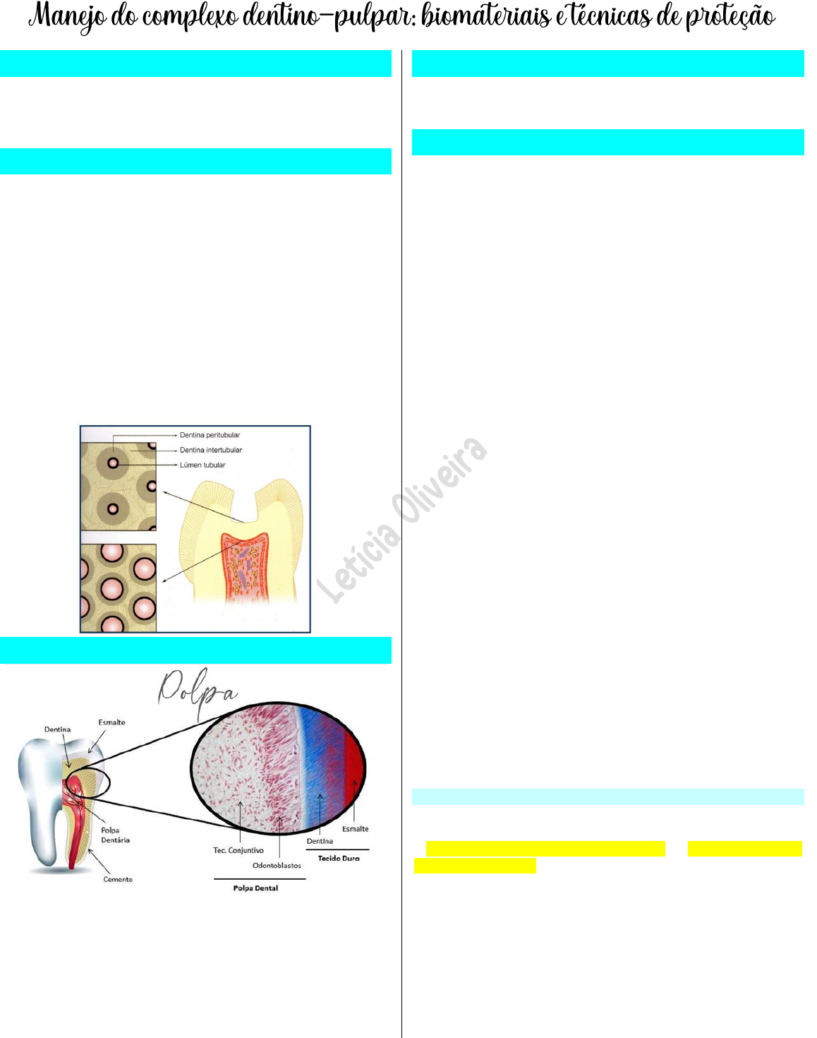 Manejo do complexo dentino- pulpar: biomateriais e técnicas de proteção Esmalte • Tecido duro • Resistente ao desgaste • Impermeável e bom isolante elétrico • Protege o órgão dental dos agentes externos Dentina • É permeável • Pouco resistente ao desgaste • Bom condutor elétrico • É resiliente (protege o esmalte que pela sua dureza e alto grau de mineralização, é extremamente friável). • Não é tão mineralizado quanto o esmalte • Tecido mais suscetível aos agentes agressores e a desmineralização • Apresenta uma íntima relação com a polpa • Possui túbulos dentinários (estruturas cilíndricas) que são vias de permeabilidade do meio externo para o meio interno • A dentina mais próxima à polpa possui os túbulos dentinários com maior diâmetro • Quanto mais a profunda cavidade, maior o risco de agentes agressores de penetrarem e chegarem a polpa Polpa • TC altamente especializado • Responsável pela vitalidade do dente • Comunicação com o feixe vásculo-nervoso através dos forames apicais • Produz dentina • Função nutritiva, sensitiva • Totalmente interligada a dentina, ambas se relacionam. A polpa é estimulada a produzir dentina e a dentina protege a polpa. Proteção do complexo-pulpar • Consiste na aplicação de um ou mais agentes protetores, tanto em tecido dentinário quanto sobre a polpa que sofreu exposição, a fim de manter ou recuperar a vitalidade desses órgãos Agentes de proteção pulpar • Nenhum material atende todos os requisitos. Por isso, as vezes é necessário associar o uso dos materiais. Requisitos: • Bactericida/bacteriostático • Bom isolante térmico e elétrico • Estimular a formação de dentina terciária • Ser inócuo à polpa • Estimular a recuperação das funções biológicas da polpa • Apresentar adesão • Ser biocompatível • Ser insolúvel ao meio bucal Seladores: • Verniz cavitário e Sistema Adesivo • O óxido de zinco e eugenol era muito utilizado em restaurações de amálgama. Atualmente não se usa tanto. • Produzem uma fina película protetora • A maioria são líquidos • Atuam por meio do vedamento da cavidade e dos túbulos dentinários, auxiliam na adesão do material restaurador, por isso seu uso dependerá do material restaurador utilizado. • Não possuem propriedades termoelétricas, nem bacteriostáticas. Forradores: • Cimento Hidróxido de cálcio e Agregado Trióxido mineral (MTA) • Também formam uma fina película protetora e estimulante à polpa • Usados em áreas muito próximas a polpa • Induzem a formação de dentina terciária e o reparo da polpa • Devem ser bactericidas ou bacteriostáticos e reduzir os efeitos tóxicos dos materiais restauradores sobre a polpa • A função dos agentes forradores é a proteção pulpar • Devem ser aplicados apenas em assoalho da cavidade, devido às suas baixas propriedades mecânicas, ou seja, esses materiais necessitam de muitas propriedades biológicas do que realmente de mecânicas. Base: • Cimento Ionômero de vidro • Coloca-se em espessura de 3mm • Protege os agentes forradores Verniz cavitário • São compostas a base de resina natural (copal) dissolvida em clorofórmio, acetona ou éter (solventes) • Indicados para restaurações de amálgama e contraindicados para restaurações em resina • Não confundir com o verniz fluoretado • Impermeabiliza a entrada dos túbulos dentinários, impedindo a penetração de bactérias, íons metálicos do amálgama, agentes infiltrantes, etc • Mistura de resina extraída de um vegetal + solventes • É uma substância temporária (é volátil) ➢ O espaço deixado pelo verniz será substituído pela deposição dos produtos de corrosão do amálgama, sendo benéfico para a restauração, pois não haverá infiltração Nos dias atuais... usar ou não o verniz cavitário? • “Como apresentam baixa solubilidade inicial em água, são inertes aos fluidos orais e podem permanecer por um determinado período sobre as estruturas dentais. Assim a função do verniz é a de diminuir a infiltração marginal até que haja deposição dos produtos de corrosão ao longo da restauração” Protocolo de aplicação • Aplicação deve ser feita com auxílio de um pincel ou microbush ➢ Pincelar de forma unilateral nas paredes circundantes do preparo • Aplica a 1ª camada de forma unidirecional em todas as paredes internas • Jatos de ar por 30 segundos • Aplica a 2ª camada • Jatos de ar por 30 segundos Sistemas adesivos • Compostos a base de monômero resinoso (Bis GMA, TEGDMA, UDMA) • Usados associados a resinas compostas ou amálgama adesivo • Une o dente a restauração e protege o complexo dentino-pulpar Hidróxido de cálcio • Biocompatível • pH alto (> 12): Neutraliza a cavidade • Ação antibacteriana • Estimula a formação de dentina esclerosada e reacional • Protege contra estímulos termoelétrico • Hemostático • Pode ser utilizado em cima da polpa exposta ➢ Induz uma resposta de necrose controlada e localizada na polpa ➢ Faz a polpa estimular a produção de dentina → ponte de dentina (dentina terciária) • Usado em cavidades muito profundas (próximas a polpa ou com exposição pulpar) Apresentação Comercial: • Pó (PA) ou pasta ➢ P.A (pró-análise): puro, 100% hidróxido de cálcio ➢ Uso direto na polpa exposta • Cimento ou pasta Classificação: 1. Autoativados (quimicamente ativados): ➢ 2 pastas (base e catalisadora); ➢ Pequeno tempo de trabalho; (curto) ➢ Relativa solubilidade; ➢ Não suporta a pressão de condensação do amálgama (baixa resistência a compressão) → não fazer a condensação do material sobre ele, devido ao risco de quebra. Usar sempre uma base de ionômero de vidro) 2. Fotoativados (ativados por luz): ➢ Pasta única ➢ Baixa solubilidade ➢ Tempo de trabalho prolongado ➢ Suporta a pressão de condensação do amálgama 