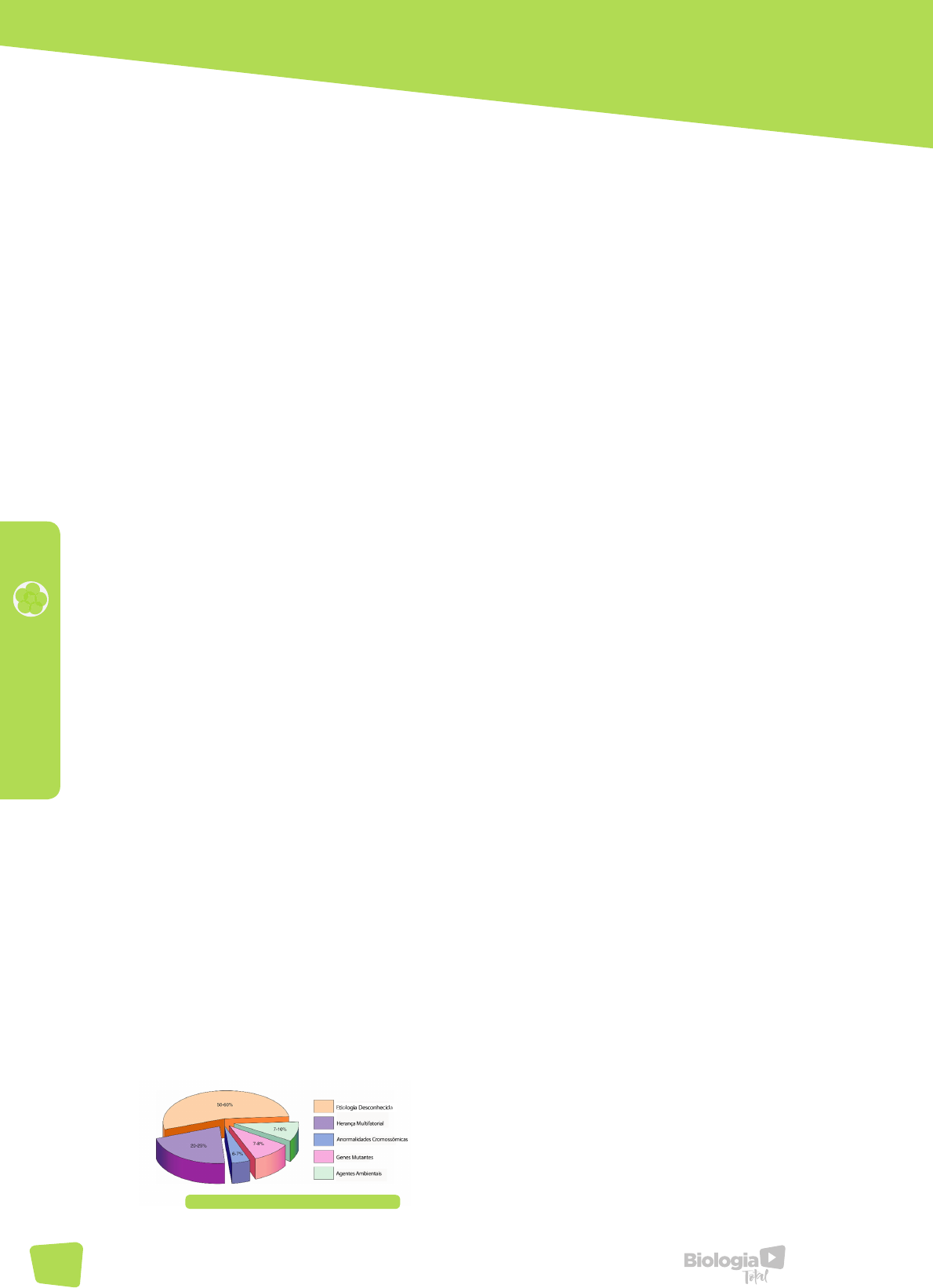 98 EM BR IO LO GI A ANOMALIAS CONGÊNITAS HUMANAS 1. INTRODUÇÃO No início da década de 40 foram feitos os primeiros relatos de que um agente infeccioso (vírus da rubéola) poderia causar malformações congênitas graves. Na década de 50, filhos de mães que utilizaram o sedativo e antiemético talidomida durante a gestação, nasceram com graves anomalias nos membros e outras alterações no desenvolvimento. Até então, acreditava-se que os embriões estavam protegidos de agentes infecciosos e químicos devido às membranas placentárias. Com estes relatos, iniciou-se os estudos do papel dos fármacos/drogas e de agentes biológicos na etiologia das anomalias congênitas humanas. As anomalias ou malformações congênitas são alterações no desenvolvimento presentes ao nascimento. Elas são importantes causas de morte na infância, de doenças crônicas e deficiência. Segundo a Organização Mundial de Saúde (OMS), dentre as 2,68 milhões de mortes durante o período neonatal em 2015 no mundo, 303 mil foram em consequência de anomalias congênitas. 2. ETIOLOGIA As causas das anomalias congênitas são divididas em: fatores genéticos, ambientais e herança multifatorial (Fig. 1). De 20-25% das anomalias congênitas têm herança multifatorial, entre 6-7% devem-se a anormalidades cromossômicas, de 7-8% são causadas por genes mutantes e entre 7-10% têm como causadores os agentes ambientais. Entretanto, cerca de 50- 60% têm etiologia desconhecida. Figura 1 – Causas de anomalias congênitas humanas. Adaptado MOORE, K.; PERSAUD, T.V.N. (2012). 2.1. FATORES GENÉTICOS Os fatores genéticos são as causas mais frequentes de anomalias congênitas, cerca de 15%, sendo eles anormalidades cromossômicas e genes mutantes. As anormalidades cromossômicas estão presentes em 6-7% dos zigotos. Muitos zigotos, blastocistos e embriões com anormalidades cromossômicas são abortados até a 3 ª semana de desenvolvimento. Muitos nem sofrem clivagem e não se tornam blastocistos. Veja maiores detalhes sobre as anormalidades cromossômicas numéricas e estruturais na disciplina de Genética Humana. 2.2. FATORES AMBIENTAIS Teratógeno é qualquer agente químico, físico ou biológico que pode causar um defeito congênito ou ainda aumentar a incidência de um determinado defeito na população. Os teratógenos têm diferentes mecanismos de ação. No geral, induzem uma resposta celular inicial que irá causar alterações celulares, como morte celular, falhas nos movimentos morfogenéticos, rompimento mecânico, entre outros. Como resultado final ocorre a morte intrauterina, defeitos no desenvolvimento, retardo do crescimento fetal ou perturbações funcionais. O período mais crítico do desenvolvimento para a exposição a teratógenos está entre a 3ª e a 8ª semana (Fig. 2). Como essa é a fase de diferenciação e morfogênese, grandes defeitos no desenvolvimento podem acontecer. A exposição a teratógenos durante o período fetal pode resultar principalmente em alterações funcionais (Ex: Retardo mental). 99www.biologiatotal.com.br EM BR IO LO GI A Adaptado SADLER, T. W. (2013). Figura 3 – Risco de indução de defeitos congênitos nos períodos embrionário e fetal. Tabela 1 - Teratógenos humanos e malformações congênitas associadas. Adaptado SADLER, T. W. (2013). Figura 2 – Sensibilidade a teratógenos nos diferentes períodos de desenvolvimento. Além do período de exposição ao agente ambiental (Fig. 3), outros fatores como a dose do fármaco e o genótipo do embrião influenciam a possibilidade de teratogenicidade. Para que um fármaco seja considerado teratogênico é necessário que se observe uma relação dose- resposta: quanto maior a dose do medicamento, maior o efeito fenotípico. 2.2.1. Fármacos/Drogas e Agentes químicos Cerca de 2% das anomalias congênitas são causadas por fármacos/drogas e outros agentes químicos. Algumas substâncias comprovadamente teratogênicas são mostradas na tabela 1. Teratógeno Malformações congênitas Agentes infecciosos Vírus da rubéola catarata, glaucoma, defeitos cardíacos, perda de audição, anomalias nos dentes Citomegalovírus Microcefalia, comprimento visual, retardo mental, morte fetal Herpes-vírus simples Microftalmia, microcefalia, displasia da retina Vírus varicela Cicatrizes na pele, hipoplasia dos membros, retardo mental, atrofia muscular Toxoplasmose Hidrocefalia, calcificações cerebrais, microftalmia Sífilis Retardo mental, perda auditiva Agentes físicos Raio X Microcefalia, espinha bífida, fenda palatina, defeitos nos membros Hipertermia Anecefalia, espinha bífida, retardo mental Agentes químicos Talidomida Defeitos nos membros, malformações cardíacas Aminopterina Anencefalia, hidrocefalia, fendas labial e palatina Difenil-hidantoína (fenitoina) Síndrome de hidantoína fetal: defeitos faciais, retardo mental Ácido valproico Defeitos do tube neural; anomalias cardíacas, craniofaciais e esqueléticas Lítio Malformações cardíacas ISRS Malformações cardíacas Anfetaminas Fenda labial e palatina, defeitos cardíacos Varfarina Anomalias esqueléticas (hipoplasia nasal, epífises pontilhadas) Inibidores da ECA Retardo do crescimento, morte fetal Micofenolato de mofetila Fendas labial e palatina, defeitos cardíacos, microtia, microcefalia Álcool Sindrome alcoólica fetal (SAF), fissuras palpebrais crustas, hipoplasia maxilar, defeitos cardíacos, retardo mental Isotretinoína (vitamina A) Embriopatia da isotretinoína: olhos pequenos e com formato anormal, hipoplasia mandibular, fenda palatina, defeitos cardíacos Solventes industriais Baixo peso ao nascer, defeitos craniofaciais e do tubo neural Mercúrio orgânico Manifestações neurológicas semelhantes às da paralisia cerebral Hormônios Agentes androgênicos Masculinização da genitália feminina: lábios fundidos, hipertrofia do clitóris (etisterona, noretisterona) DES Malformação do útero, das tubas uterinas e da porçã