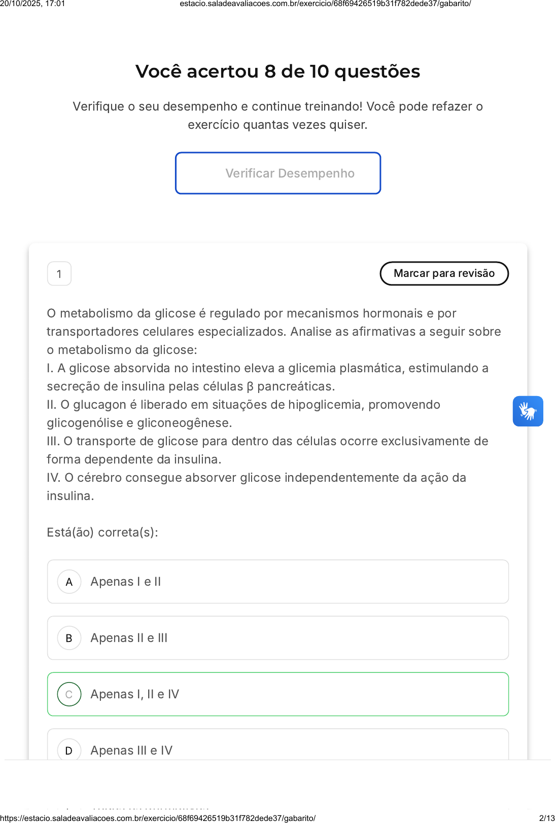 Você acertou 8 de 10 questões Verifique o seu desempenho e continue treinando! Você pode refazer o exercício quantas vezes quiser. Verificar Desempenho A B C D E 1 Marcar para revisão O metabolismo da glicose é regulado por mecanismos hormonais e por transportadores celulares especializados. Analise as afirmativas a seguir sobre o metabolismo da glicose: I. A glicose absorvida no intestino eleva a glicemia plasmática, estimulando a secreção de insulina pelas células β pancreáticas. II. O glucagon é liberado em situações de hipoglicemia, promovendo glicogenólise e gliconeogênese. III. O transporte de glicose para dentro das células ocorre exclusivamente de forma dependente da insulina. IV. O cérebro consegue absorver glicose independentemente da ação da insulina. Está(ão) correta(s): Apenas I e II Apenas II e III Apenas I, II e IV Apenas III e IV Todas as afirmativas 20/10/2025, 17:01 estacio.saladeavaliacoes.com.br/exercicio/68f69426519b31f782dede37/gabarito/ https://estacio.saladeavaliacoes.com.br/exercicio/68f69426519b31f782dede37/gabarito/ 2/13 E A B C D E Todas as afirmativas Resposta correta Parabéns, você selecionou a alternativa correta. Confira o gabarito comentado! Gabarito Comentado A insulina e o glucagon regulam a glicemia de forma oposta. A captação de glicose pode ser dependente ou independente da insulina, como ocorre no cérebro, graças a transportadores como o GLUT1. 2 Marcar para revisão A dosagem da hemoglobina glicada (HbA1c) é um exame amplamente utilizado no acompanhamento do diabetes mellitus (DM). Esse marcador tem a vantagem de refletir a média glicêmica de um período de tempo anterior ao exame. Qual das alternativas apresenta corretamente esse intervalo de tempo? 1 a 3 dias 1 a 3 semanas 30 a 45 dias 60 a 120 dias 180 a 240 dias Resposta correta Parabéns, você selecionou a alternativa correta. Confira o gabarito comentado! 20/10/2025, 17:01 estacio.saladeavaliacoes.com.br/exercicio/68f69426519b31f782dede37/gabarito/ https://estacio.saladeavaliacoes.com.br/exercicio/68f69426519b31f782dede37/gabarito/ 3/13 A B C D E Gabarito Comentado A HbA1c reflete a média da glicemia nos últimos 2 a 4 meses (60 a 120 dias), pois acompanha a vida média dos eritrócitos. Por isso, fornece uma visão integrada da exposição do organismo à glicose nesse período, diferentemente da glicemia de jejum, que mostra apenas um retrato pontual. 3 Marcar para revisão A aterosclerose é uma doença arterial complexa, na qual deposição de colesterol, inflamação e formação de trombo desempenham papéis importantes. Qual das lipoproteínas abaixo, quando oxidada, está envolvida diretamente com a formação da placa de ateroma? HDL IDL LDL Quilomícrons VLDL Resposta correta Parabéns, você selecionou a alternativa correta. Confira o gabarito comentado! Gabarito Comentado A lipoproteína LDL, quando oxidada, está diretamente envolvida na formação da placa de ateroma. A aterosclerose é uma doença arterial l d d i ã d l l i fl ã f ã d 20/10/2025, 17:01 estacio.saladeavaliacoes.com.br/exercicio/68f69426519b31f782dede37/gabarito/ https://estacio.saladeavaliacoes.com.br/exercicio/68f69426519b31f782dede37/gabarito/ 4/13 A B C D complexa, onde a deposição de colesterol, inflamação e formação de trombo são fatores cruciais. A LDL, conhecida como "colesterol ruim", quando oxidada, contribui para a formação de placas de ateroma, que são depósitos de gordura e colesterol que se formam nas paredes das artérias, podendo levar ao seu estreitamento ou obstrução, causando problemas cardiovasculares. 4 Marcar para revisão (Adaptado de Enade, Biomedicina, 2010) Os lipídios constituem um grupo de moléculas insolúveis em água e são transportados no plasma na forma de lipoproteínas. Essas são classificadas de acordo com o tamanho e a densidade em quilomícrons, lipoproteínas de densidade muito baixa (VLDL), lipoproteínas de baixa densidade (LDL) e lipoproteínas de densidade alta (HDL). Em relação às lipoproteínas, avalie as afirmativas que seguem. I. Os quilomícrons liberados pela mucosa intestinal são convertidos diretamente em VLDL no plasma sanguíneo. II. As lipoproteínas são constituídas por um núcleo de lipídios neutros envolvido por uma camada anfipática de apoproteínas, fosfolipídios e colesterol. III. A função das apoproteínas é fornecer sítios de reconhecimento para receptores nas superfícies celulares e serem ativadoras de enzimas envolvidas no metabolismo de lipoproteínas. IV. A LDL tem alta concentração de colesterol e ésteres de colesterol, liga-se na superfície da membrana celular através do reconhecimento da apoproteína B- 100. V. O colesterol captado da LDL pelas células age aumentando a síntese de colesterol e de receptores. O colesterol em excesso é convertido em éster de colesterol e armazenado. Está correto apenas o que se afirma em I, II e III I, II e IV I, IV e V II III e IV 20/10/2025, 17:01 estacio.saladeavaliacoes.com.br/exercicio/68f69426519b31f782dede37/gabarito/ https://estacio.saladeavaliacoes.com.br/exercicio/68f69426519b31f782dede37/gabarito/ 5/13 D E II, III e IV III, IV e V Resposta incorreta Opa! A alternativa correta é a letra D. Confira o gabarito comentado! Gabarito Comentado As afirmativas II, III e IV estão corretas. A afirmativa II está correta porque as lipoproteínas são de fato constituídas por um núcleo de lipídios neutros envolvido por uma camada anfipática de apoproteínas, fosfolipídios e colesterol. A afirmativa III também está correta, pois a função das apoproteínas é fornecer sítios de reconhecimento para receptores nas superfícies celulares e serem ativadoras de enzimas envolvidas no metabolismo de lipoproteínas. Por fim, a afirmativa IV está correta, pois a LDL tem alta concentração de colesterol e ésteres de colesterol e se liga na superfície da membrana celular através do reconhecimento da apoproteína B-100. 5 Marcar para rev