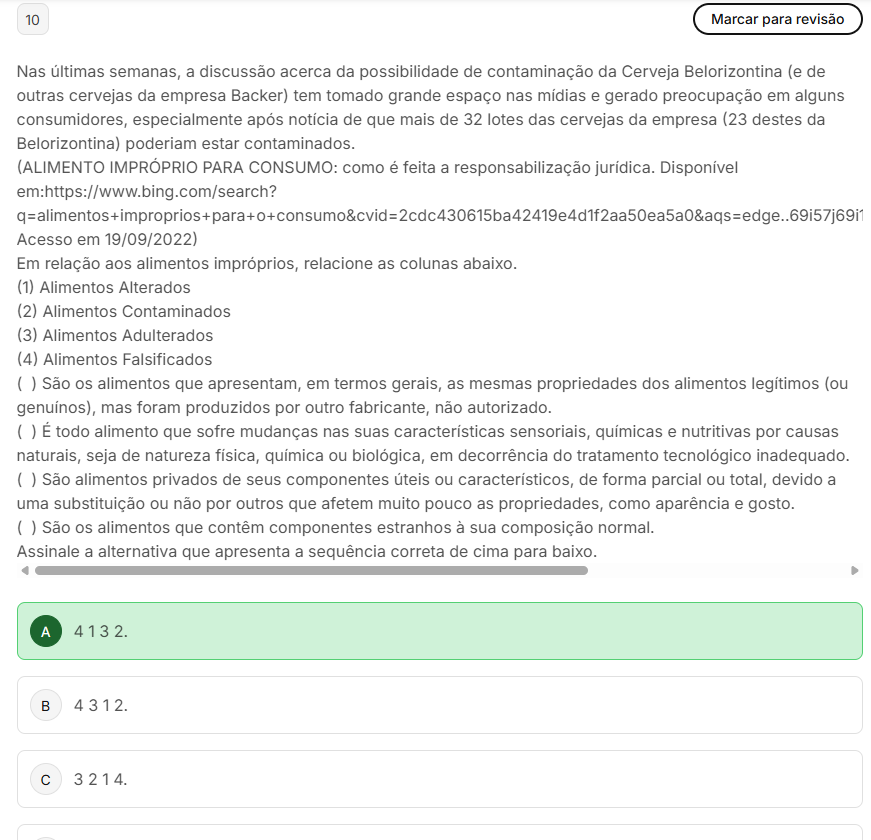 10 Marcar para revisão Nas últimas semanas, a discussão acerca da possibilidade de contaminação da Cerveja Belorizontina (e de outras cervejas da empresa Backer) tem tomado grande espaço nas e gerado preocupação em alguns consumidores, especialmente após de que mais de 32 lotes das cervejas da empresa (23 destes da Belorizontina) poderiam estar contaminados. (ALIMENTO IMPRÓPRIO PARA CONSUMO: como é feita a responsabilização jurídica. Disponível Acesso em 19/09/2022) Em relação aos alimentos impróprios, relacione as colunas abaixo. (1) Alimentos Alterados (2) Alimentos Contaminados (3) Alimentos Adulterados (4) Alimentos Falsificados São OS alimentos que apresentam, em termos gerais, as mesmas propriedades dos alimentos legítimos (ou genuínos), mas foram produzidos por outro fabricante, não autorizado. É todo alimento que sofre mudanças nas suas características sensoriais, químicas e nutritivas por causas naturais, seja de natureza química ou biológica, em decorrência do tratamento tecnológico inadequado. São alimentos privados de seus componentes úteis ou característicos, de forma parcial ou total, devido a uma substituição ou não por outros que afetem muito pouco as propriedades, como aparência e gosto. São alimentos que contêm componentes estranhos à sua composição normal. Assinale a alternativa que apresenta a sequência correta de cima para baixo. A 4132. B 4312. C 3214.