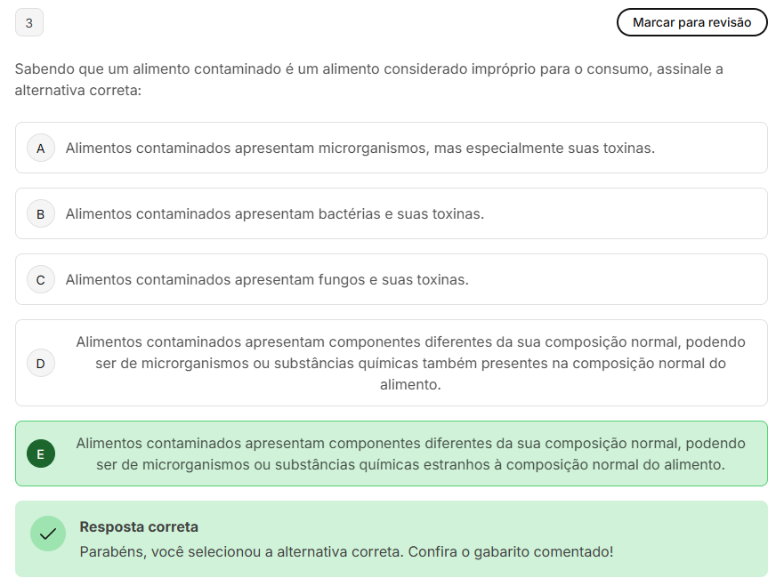 3 Marcar para revisão Sabendo que um alimento contaminado é um alimento considerado impróprio para consumo, assinale a alternativa correta: A Alimentos contaminados apresentam microrganismos, mas especialmente suas toxinas. B Alimentos contaminados apresentam bactérias e suas toxinas. C Alimentos contaminados apresentam fungos e suas toxinas. Alimentos contaminados apresentam componentes diferentes da sua composição normal, podendo D ser de microrganismos ou substâncias químicas também presentes na composição normal do alimento. Alimentos contaminados apresentam componentes diferentes da sua composição normal, podendo E ser de microrganismos ou substâncias estranhos à composição normal do alimento. Resposta correta Parabéns, você selecionou a alternativa correta. Confira O gabarito comentado!
