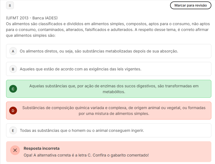 8 Marcar para revisão (UFMT 2013 Banca IADES) Os alimentos são classificados e divididos em alimentos simples, compostos, aptos para consumo, não aptos para O consumo, contaminados, alterados, falsificados e adulterados. A respeito desse tema, é correto afirmar que alimentos simples são: A Os alimentos diretos, ou seja, são substâncias metabolizadas depois de sua absorção. B Aqueles que estão de acordo com as exigências das leis vigentes. Aquelas substâncias que, por ação de enzimas dos sucos digestivos, são transformadas em C metabólitos. Substâncias de composição química variada e complexa, de origem animal ou vegetal, ou formadas D por uma mistura de alimentos simples. E Todas as que 0 homem ou 0 animal conseguem ingerir. X Resposta incorreta Opa! A alternativa correta a letra C. Confira 0 gabarito comentado!