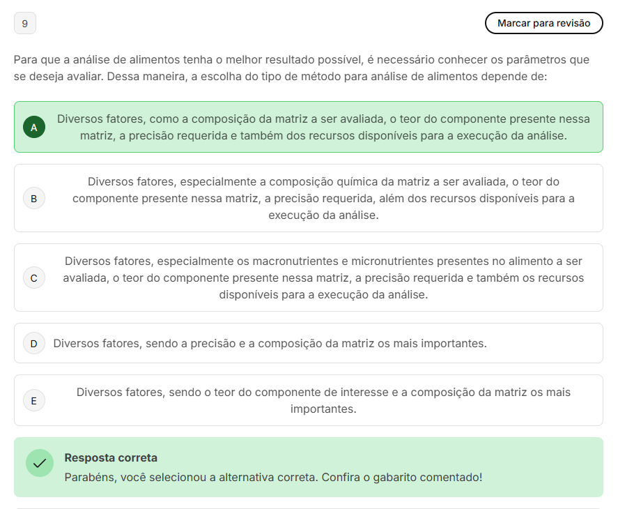 9 Marcar para revisão Para que a análise de alimentos tenha melhor resultado possível, é necessário conhecer OS parâmetros que se deseja avaliar. Dessa maneira, a escolha do tipo de método para análise de alimentos depende de: Diversos fatores, como a composição da matriz a ser avaliada, O teor do componente presente nessa A matriz, a precisão requerida e também dos recursos disponíveis para a execução da análise. Diversos fatores, especialmente a composição química da matriz a ser avaliada, O teor do B componente presente nessa matriz, a precisão requerida, além dos recursos disponíveis para a execução da Diversos fatores, especialmente OS macronutrientes e micronutrientes presentes no alimento a ser C avaliada, teor do componente presente nessa matriz, a precisão requerida e também OS recursos disponíveis para a execução da análise. D Diversos fatores, sendo a precisão e a composição da matriz mais importantes. Diversos fatores, sendo O teor do componente de interesse e a composição da matriz mais E importantes. Resposta correta Parabéns, você selecionou a alternativa correta. Confira O gabarito comentado!