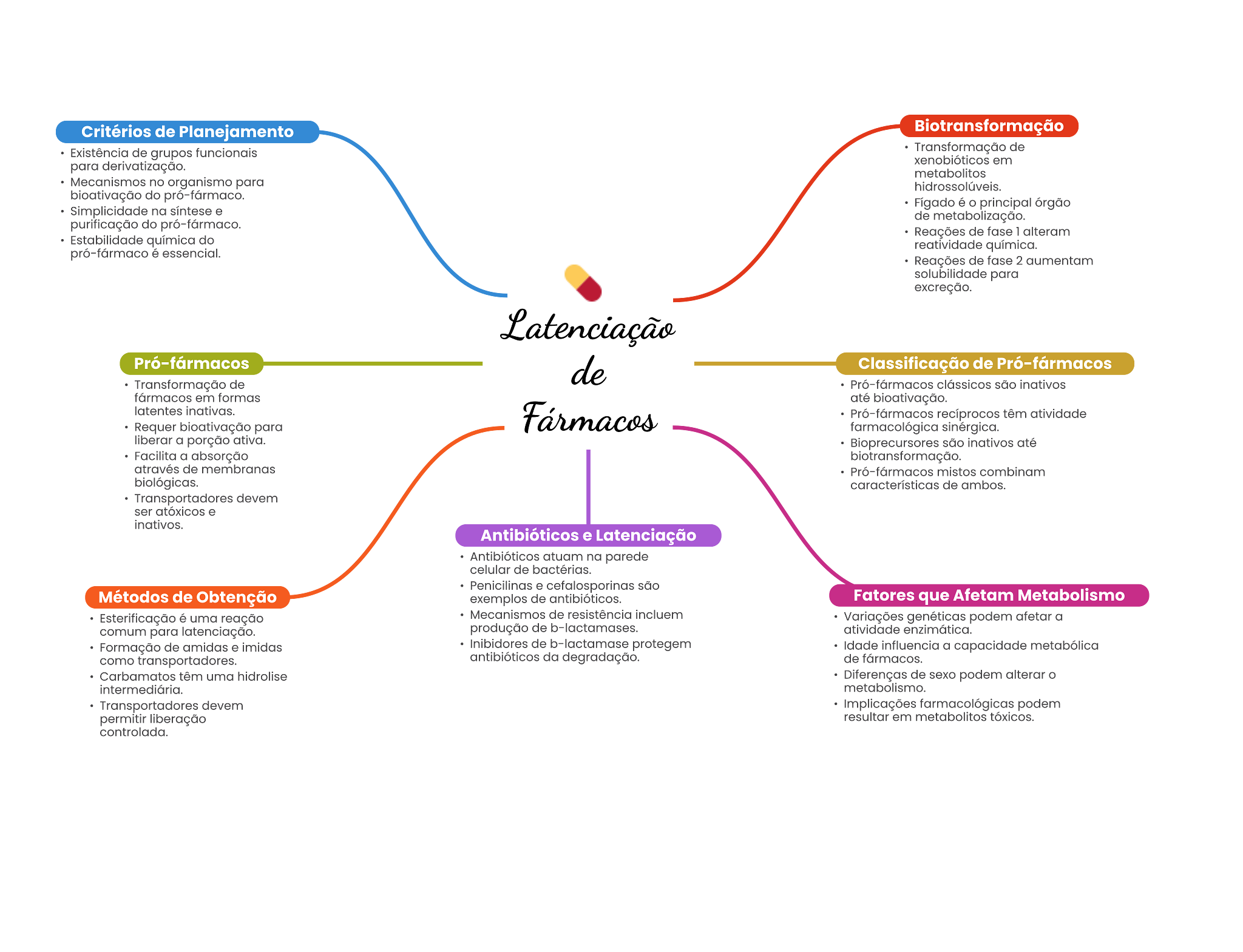 Critérios de Planejamento Biotransformação Existência de grupos funcionale Transformação de para derivatização. em metabolitos Mecanismos no organismo para do Figado principal órgão na de do pró-fármaco. de fase 1 alteram Estabilidade do reatividade de fase 2 solubilidade para excreção. Pró-fármacos Classificação de Pró-fármacos Transformação de Pró-fármacos são fármacos em formas até bioativação. Pró-fármacos atividade Requer para farmacológica liberar a porção ativa. são inativos a absorção biotransformação. de Pró-fármacos mistos combinam biológicas. características de ambos. Transportadores devem ser Antibióticos e Latenciação atuam na parede de . são Métodos de Obtenção exemplos de antibióticos. Fatores que Afetam Metabolismo Esterificação é uma de resistência Variações genéticas podem a comum para produção de atividade enzimática. Formação de amidas e de protegem Idade influencia a capacidade metabólica como antibióticos da degradação. de Carbamatos têm uma hidrolise Diferenças de podem alterar Transportadores devem Implicações farmacológicas podem permitir liberação em controlada.