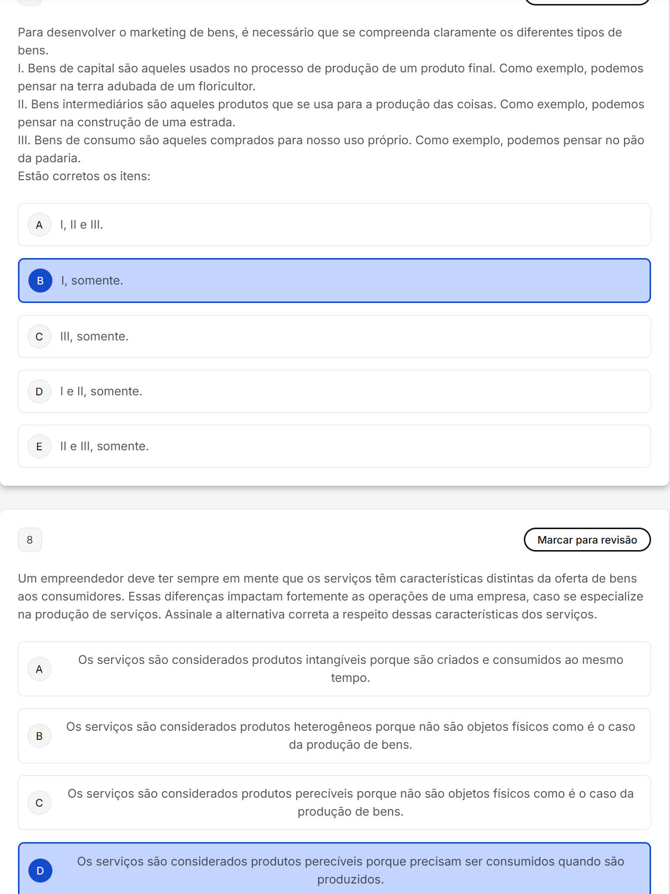 Para desenvolver marketing de bens, é necessário que se compreenda claramente os diferentes tipos de bens. I. Bens de capital são aqueles usados no processo de produção de um produto final. Como exemplo, podemos pensar na terra adubada de um floricultor. II. Bens intermediários são aqueles produtos que se usa para a produção das coisas. Como exemplo, podemos pensar na construção de uma estrada. III. Bens de consumo são aqueles comprados para nosso uso próprio. Como exemplo, podemos pensar no pão da padaria. Estão corretos os itens: A I, e III. I, somente. III, somente. D e II, somente. E e III, somente. 8 Marcar para revisão Um empreendedor deve ter sempre em mente que os serviços têm características distintas da oferta de bens aos consumidores. Essas diferenças impactam fortemente as operações de uma empresa, caso se especialize na produção de serviços. Assinale a alternativa correta a respeito dessas características dos serviços. Os serviços são considerados produtos intangíveis porque são criados e consumidos ao mesmo A tempo. Os serviços são considerados produtos heterogêneos porque não são objetos físicos como é caso da produção de bens. Os serviços são considerados produtos perecíveis porque não são objetos físicos como é caso da c produção de bens. Os serviços são considerados produtos perecíveis porque precisam ser consumidos quando são D produzidos.