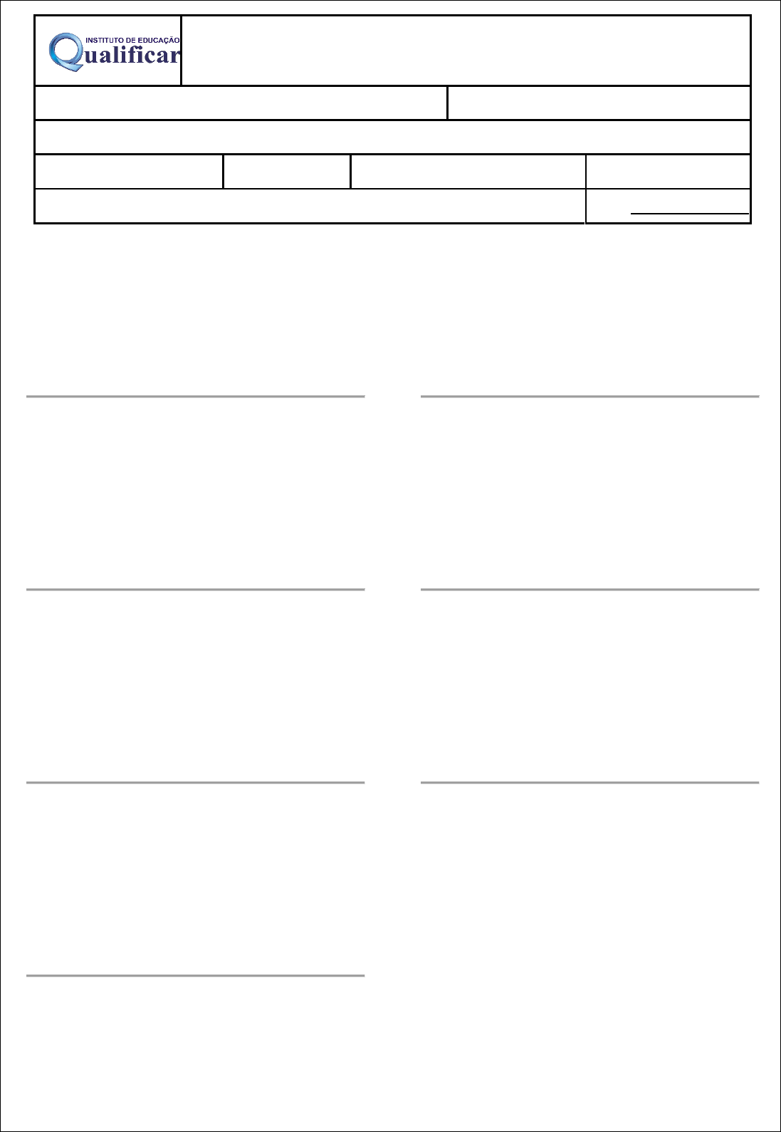 INSTITUTO DE EDUCAÇÃO QUALIFICAR RESOLUÇÃO SEE Nº 4.661 DE 18 DE NOVEMBRO DE 2021 Avenida Donato Quintino, 90 – Cidade nova - Montes Claros/MG DISCILPLINA: INFORMÁTICA APLICADA CURSO: TÉCNICO MEIO AMBIENTE PROFESSOR(A): GUILHERME DIAS SANTANA MÓDULO: I TURMA: DATA: VALOR: 30 ALUNO(A): NOTA 1. No Excel, qual é a função principal da fórmula =MÉDIA(A1:A4)? a) Exibir o maior número do intervalo A1 até A4. b) Calcular a média dos valores entre as células A1 e A4. c) Somar os valores e multiplicar por dois. d) Contar quantas células estão preenchidas. 2. Em uma planilha, os valores de B1, B2 e B3 são: 10, 15 e 20. Qual será o resultado de =MÉDIA(B1:B3)? a) 15 b) 13 c) 10 d) 20 3. Qual das alternativas apresenta corretamente a função SE para verificar se um aluno está aprovado com nota mínima 6? a) =SE(A16;"Reprovado";"Aprovado") c) =SE(A1>=6;"Aprovado";"Reprovado") d) =SE(A1