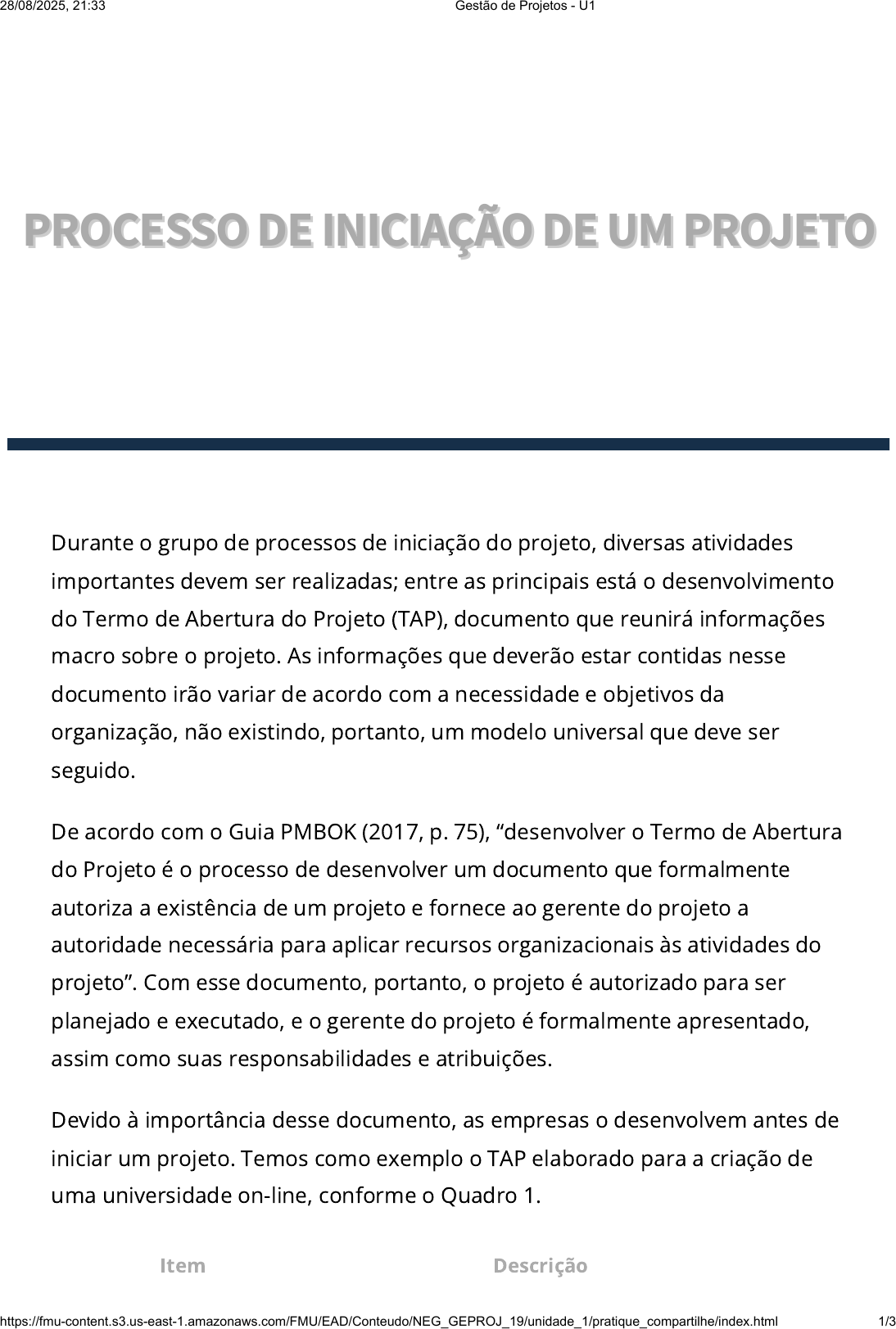 Durante o grupo de processos de iniciação do projeto, diversas atividades importantes devem ser realizadas; entre as principais está o desenvolvimento do Termo de Abertura do Projeto (TAP), documento que reunirá informações macro sobre o projeto. As informações que deverão estar contidas nesse documento irão variar de acordo com a necessidade e objetivos da organização, não existindo, portanto, um modelo universal que deve ser seguido. De acordo com o Guia PMBOK (2017, p. 75), “desenvolver o Termo de Abertura do Projeto é o processo de desenvolver um documento que formalmente autoriza a existência de um projeto e fornece ao gerente do projeto a autoridade necessária para aplicar recursos organizacionais às atividades do projeto”. Com esse documento, portanto, o projeto é autorizado para ser planejado e executado, e o gerente do projeto é formalmente apresentado, assim como suas responsabilidades e atribuições. Devido à importância desse documento, as empresas o desenvolvem antes de iniciar um projeto. Temos como exemplo o TAP elaborado para a criação de uma universidade on-line, conforme o Quadro 1. Item Descrição PROCESSO DE INICIAÇÃO DE UM PROJETOPROCESSO DE INICIAÇÃO DE UM PROJETO 28/08/2025, 21:33 Gestão de Projetos - U1 https://fmu-content.s3.us-east-1.amazonaws.com/FMU/EAD/Conteudo/NEG_GEPROJ_19/unidade_1/pratique_compartilhe/index.html 1/3 Quadro 1 - Exemplo de um Termo de Abertura de Projeto Fonte: Adaptado de Gido, Clements e Baker (2018, p. 39). Título do Projeto Criar a Universidade on-line da ASTRA Corporation. Finalidade Atualmente, a ASTRA Corporation oferece programas educacionais e de treinamento a seus funcionários em salas de aula, de forma presencial. O treinamento on-line foi solicitado pelos funcionários da ASTRA nas seis localizações da companhia na América do Norte e em cinco localizações na Europa. Objetivo Projetar, desenvolver, ministrar e avaliar 20 cursos on-line em 25 meses, com um orçamento de $ 500.000 para a elaboração, o desenvolvimento e a avaliação, e de $ 375.000 para o primeiro ano de realização. Principais entregas O fornecedor deve projetar, desenvolver, entregar e avaliar 20 cursos on-line, preparar relatórios por escrito e apresentá-los trimestralmente, além de oferecer suporte técnico em todos os momentos durante o ano após o piloto inicial. Programação de eventos importantes Cronograma do projeto para eventos importantes em meses corridos a contar da data após a assinatura do contrato com o fornecedor. Custo macro $ 1.000.000,00 gastos em quatro etapas de acordo com o ciclo de vida do projeto. Gestor do projeto Marie Kerba é a gestora do projeto designada pela ASTRA e a responsável por ele. Ela é o ponto de contato com o fornecedor e supervisionará o seu desempenho. Autorizado por Ida Trayna, vice-presidente de recursos humanos. 28/08/2025, 21:33 Gestão de Projetos - U1 https://fmu-content.s3.us-east-1.amazonaws.com/FMU/EAD/Conteudo/NEG_GEPROJ_19/unidade_1/pratique_compartilhe/index.html 2/3 Referências GIDO, J.; CLEMENTS, J.; BAKER, R. Gestão de projetos . São Paulo: Cengage, 2018. PMBOK. Guia do conhecimento em gerenciamento de projetos . 6. ed. Pensilvânia: PMI, 2017. Vamos Praticar Diante do caso apresentado, faça uma breve reflexão sobre o tema e discuta a importância da elaboração do Termo de Abertura do Projeto. Após essa análise, desenvolva um termo de abertura para um projeto fictício à sua escolha. O modelo do termo de abertura a ser seguido deverá ser o modelo apresentado no caso analisado. Ao final, disponibilize seu trabalho no fórum da seção . 28/08/2025, 21:33 Gestão de Projetos - U1 https://fmu-content.s3.us-east-1.amazonaws.com/FMU/EAD/Conteudo/NEG_GEPROJ_19/unidade_1/pratique_compartilhe/index.html 3/3