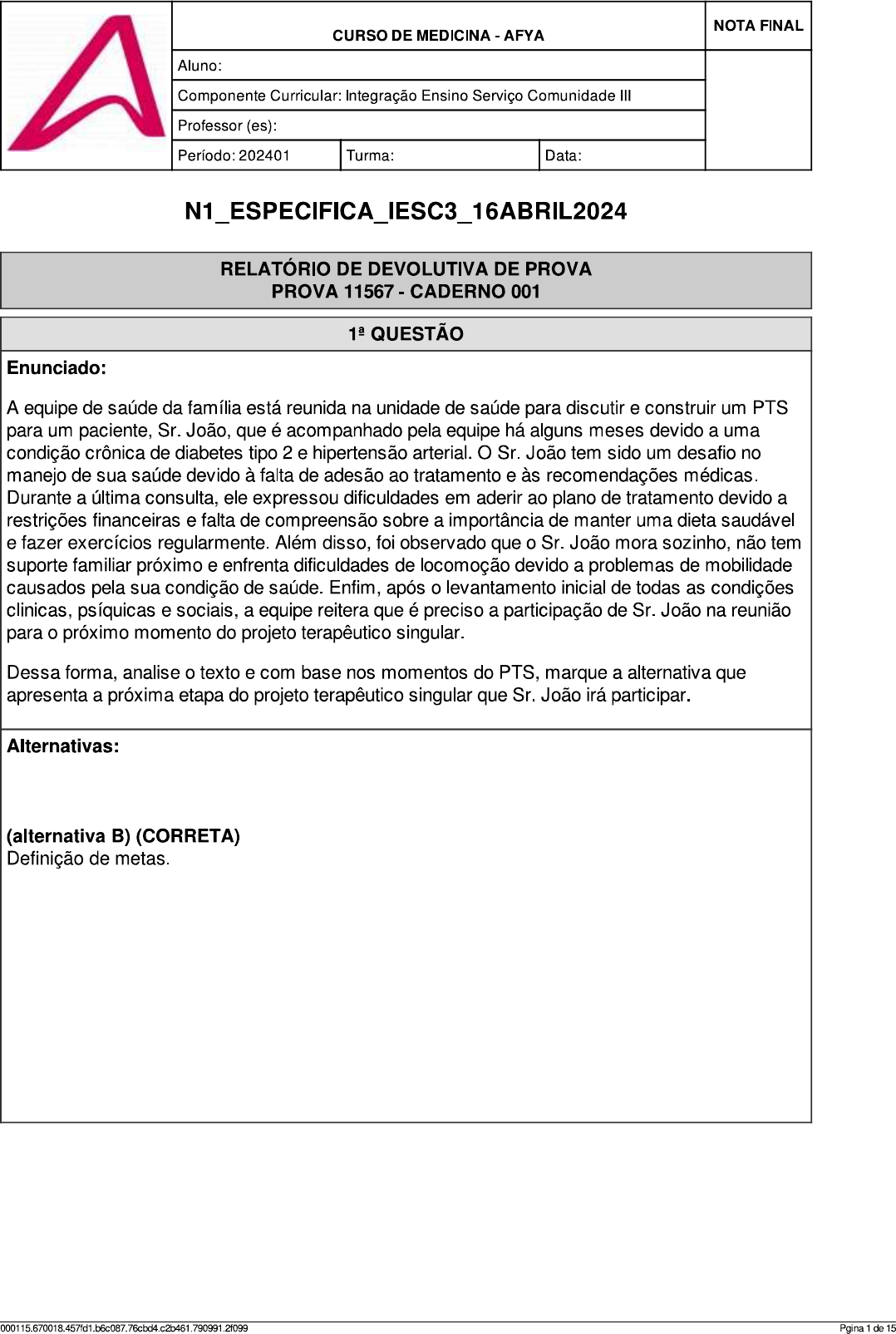 NOTA FINAL CURSO DE MEDICINA AFYA Aluno: Componente Curricular: Integração Ensino Serviço Comunidade III Professor (es): Período: 202401 Turma: Data: N1_ESPECIFICA_IESC3_16ABRIL2024 RELATÓRIO DE DEVOLUTIVA DE PROVA PROVA 11567 CADERNO 001 1ª QUESTÃO Enunciado: A equipe de saúde da família está reunida na unidade de saúde para discutir e construir um PTS para um paciente, Sr. João, que é acompanhado pela equipe há alguns meses devido a uma condição crônica de diabetes tipo 2 e hipertensão arterial. Sr. João tem sido um desafio no manejo de sua saúde devido à falta de adesão ao tratamento e às recomendações médicas. Durante a última consulta, ele expressou dificuldades em aderir ao plano de tratamento devido a restrições financeiras e falta de compreensão sobre a importância de manter uma dieta saudável e fazer exercícios regularmente. Além disso, foi observado que o Sr. João mora sozinho, não tem suporte familiar próximo e enfrenta dificuldades de locomoção devido a problemas de mobilidade causados pela sua condição de saúde. Enfim, após o levantamento inicial de todas as condições clinicas, psíquicas e sociais, a equipe reitera que é preciso a participação de Sr. João na reunião para o próximo momento do projeto terapêutico singular. Dessa forma, analise o texto e com base nos momentos do PTS, marque a alternativa que apresenta a próxima etapa do projeto terapêutico singular que Sr. João irá participar. Alternativas: (alternativa B) (CORRETA) Definição de metas. Pgina de 15Resposta comentada: texto deixa claro que a equipe levantou todas as questões que elegem Sr. João para participar do PTS, além disso no próprio texto diz que Enfim, após levantamento inicial de todas as condições clinicas, psíquicas e sociais... ou seja, a fase de diagnostico foi realizada, dessa forma, a próxima etapa é a definição de metas. 1) Diagnóstico: além do diagnóstico formal, é imprescindível que a equipe tenha um compartilhamento e discussão entre si dos diferentes modos como cada profissional percebe sujeito. É necessário realizar uma avaliação de vulnerabilidades, compreensão dos desejos, dos modos de trabalho, da cultura, da família, da rede social e da rede de apoio. 2) Definição de metas: pactuação de metas a serem desenvolvidas em curto, médio e longo prazo. Será importante, para isso, reconhecer as prioridades que o sujeito elenca (o que para ele é mais importante e/ou viável) e que do ponto de vista da equipe é mais urgente e/ou viável. Importante considerar outros atores, como familiares e cuidadores 3) Divisão de responsabilidades: seguimento do PTS pode ser mais ou menos complexo, de acordo com as metas pactuadas e com as possibilidades do sujeito. Neste sentido, é importante que tenha um profissional com quem o sujeito ou família tenha vínculo e que conheça seu Projeto para que possa, quando tiver necessidade, solicitar apoio. Este será o profissional de referência, aquele a quem a pessoa vai contatar com facilidade (não deve depender de agendamentos a médio ou longo prazo). Pode-se considerar que seja um profissional mediador: não é necessariamente quem vai resolver a demanda do sujeito, mas quem vai buscar meios para. 4) Reavaliação: Projeto Terapêutico Singular deve acompanhar a vida do sujeito e, portanto, estará sempre passível a ser revisto. A reavaliação deve ocorrer em discussões feitas pela equipe e com sujeito/família e pode ser conduzida pelo profissional de referência (aquele com quem tem mais vínculo), mas não necessariamente. BRASIL. Ministério da Saúde. Secretaria de Atenção à Saúde. Núcleo Técnico da Política Nacional de Humanização. Clínica ampliada, equipe de referência e projeto terapêutico singular. Ministério da Saúde, Secretaria de Atenção à Saúde, Núcleo Técnico da Política Nacional de Humanização. 2. ed. Brasília: Ministério da Saúde, 2007. 60 p.: il. color. Série B. Textos Básicos de Saúde. QUESTÃO Enunciado: Um agente comunitário de saúde (ACS), ao realizar visita de rotina para acompanhamento de paciente hipertenso e cardiopata, colheu relatos do paciente que o preocuparam. Ao retornar à UBS, reportou as informações ao médico de sua equipe, que programou uma visita domiciliar. No dia seguinte, ao realizar a visita, médico constatou que o paciente em questão, é divorciado e casou-se novamente. Da primeira união teve 3 filhos que moram com a mãe. Do novo casamento, teve mais dois filhos que não se relacionam com os demais irmãos paternos, situação que sempre gerou profundo conflito na família e, como consequência, "desgosto" e stress, conforme relato do paciente. Frente ao exposto, assinale a alternativa correta, em relação à tipologia dessa família. 000115.670018.457fd1.b6c087.76cbd4.c2b461.790991.2f099 Pgina 2 de 15Alternativas: (alternativa C) (CORRETA) Reconstituída. Resposta comentada: A família reconstituída é uma família composta por membros de uma família que em algum momento, teve outra configuração, sofreu uma ruptura e passou a ter novo formato. Referência: DUNCAN, BRUCE, et al. Medicina ambulatorial: condutas de atenção primária baseadas em evidências. Disponível em: Minha Biblioteca, (5th edição). Grupo A, 2022. (cap. 20). DIAS, L.C. Abordagem familiar. In: GUSSO G.; LOPES, J. M. C. (Org.). Tratado de medicina de família e comunidade: princípios, formação e prática. Porto Alegre: Artmed, 2019. Cap. 35. QUESTÃO Enunciado: Mulher, 50 anos, foi diagnosticada com esclerose lateral amiotrófica (ELA) em estágio avançado. Apresenta fraqueza muscular progressiva e perda de controle sobre os músculos respiratórios, o que a levou a depender de suporte ventilatório (ventilação mecânica). Diante das circunstâncias, a família procurou a unidade de saúde do bairro para buscar informações sobre os cuidados no ambiente domiciliar. Assinale a alternativa correta sobre tipo d