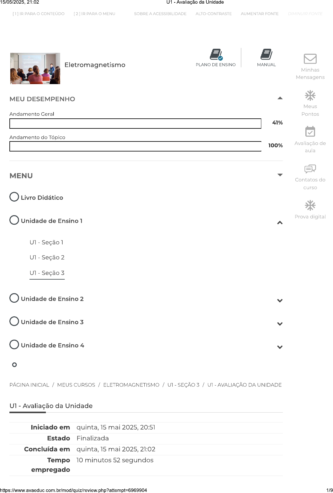 15/05/2025, 21:02 U1 Avaliação da Unidade [1] IR PARA CONTEÚDO [2] IR PARA MENU SOBRE A ACESSIBILIDADE ALTO-CONTRASTE AUMENTAR FONTE DIMINUIR FONTE Eletromagnetismo PLANO DE ENSINO MANUAL Minhas Mensagens MEU DESEMPENHO Meus Andamento Geral Pontos 41% Andamento do Tópico 100% Avaliação de aula MENU Contatos do curso Livro Didático Prova digital Unidade de Ensino 1 U1 - Seção 1 U1 - Seção 2 U1 - Seção 3 Unidade de Ensino 2 Unidade de Ensino 3 Unidade de Ensino 4 PÁGINA INICIAL / MEUS CURSOS / ELETROMAGNETISMO / U1 SEÇÃO 3 / U1 AVALIAÇÃO DA UNIDADE U1 Avaliação da Unidade Iniciado em quinta, 15 mai 2025, 20:51 Estado Finalizada Concluída em quinta, 15 mai 2025, 21:02 Tempo 10 minutos 52 segundos empregado 1/915/05/2025, 21:02 U1 Avaliação da Unidade [1] IR PARA CONTEÚDO [2] IR PARA MENU SOBRE A ACESSIBILIDADE ALTO-CONTRASTE AUMENTAR FONTE DIMINUIR FONTE Avaliar 10,00 de um máximo de 10,00(100%) 2/915/05/2025, 21:02 U1 Avaliação da Unidade IR PARA CONTEÚDO [2] IR PARA MENU SOBRE A ACESSIBILIDADE ALTO-CONTRASTE AUMENTAR FONTE DIMINUIR FONTE Correto Atingiu 1,00 de 1,00 Um forma de caracterizar um ponto ao redor de uma carga elétrica é através do Potencial Elétrico, E uma medida associada ao nível de energia potencial de um ponto de um campo elétrico. Considere uma partícula de carga em um campo elétrico uniforme e vertical que se desloca do ponto "A" ao ponto "E", conforme a figura a seguir: A X Z D C d W E Fonte: SILVA, Rafael Schincariol. Eletromagnetismo. Adaptado. Onde: AB = 4 cm, BC= 5 cm, CD=3 cm, DE=6 cm, d=8 cm e Considerando um campo elétrico de módulo 100N/C, calcule a diferença de potencial elétrico entre ponto "A" e ponto "E" assinalando a alternativa correta: Escolha uma: a. 6V b. 8V C. 10 V d. 12 V 3/915/05/2025, 21:02 U1 Avaliação da Unidade [1] IR PARA CONTEÚDO [2] IR PARA MENU SOBRE A ACESSIBILIDADE ALTO-CONTRASTE AUMENTAR FONTE DIMINUIR FONTE 14 V 4/915/05/2025, 21:02 U1 Avaliação da Unidade [1] IR PARA CONTEÚDO [2] IR PARA MENU SOBRE A ACESSIBILIDADE ALTO-CONTRASTE AUMENTAR FONTE DIMINUIR FONTE Correto Atingiu 1,00 de 1,00 Quando a distribuição de cargas apresenta alta simetria a Lei de Gauss é operacionalmente útil (embora possa ser usada em qualquer situação) por tornar mais simples cálculo do fluxo do campo elétrico. Considere que exista um amontoado de cargas Q uniformemente distribuídas em uma superfície no formato de uma casca vazia não simétrica, conforme a figura a seguir: Figura 1 Exemplo de simetria esférica casca carregada. Q Fonte: SILVA, Rafael Schincariol. Eletromagnetismo. Adaptado. Admitindo-se uma superfície gaussiana S no interior dessa casca vazia, avalie as seguintes asserções e a relação proposta entre elas: I. campo elétrico na superfície S é igual a zero. PORQUE II. A carga interna a superfície S é nula. A respeito dessas asserções, assinale a alternativa correta: Escolha uma: a. as asserções e são proposições verdadeiras, e a é uma justificativa da b. as asserções e são proposições verdadeiras, mas a não é uma justificativa da I. C. a asserção lé uma proposição verdadeira, e a é uma proposição falsa. d. a asserção lé uma proposição falsa, e a é uma proposição verdadeira. 5/915/05/2025, 21:02 U1 Avaliação da Unidade [1] IR PARA CONTEÚDO [2] IR PARA MENU SOBRE A ACESSIBILIDADE ALTO-CONTRASTE AUMENTAR FONTE DIMINUIR FONTE as proposições idisas. Questão 3 Correto Atingiu 1,00 de 1,00 A Lei de Gauss embora possa ser aplicada a qualquer superfície fechada, com campo elétrico uniforme ou não, pode apresentar complicações em seus cálculos. Por isso, três tipos de simetrias usadas facilitam uso da Lei de Gauss, sendo elas: planar, cilíndrica e esférica. A simetria esférica é comumente utilizada no cálculo do campo de uma carga puntiforme e pode ser estendida de modo a resultar na Lei das Cascas. Com relação a Lei das Cascas, complete as lacunas a seguir: A lei das cascas determina que campo no interior de uma casca carregada eletricamente e uniformemente é igual enquanto que a carga no exterior desta casca é igual à carga de uma carga de mesmo valor de carga total, localizada a uma distância do ponto em que se deseja obter campo elétrico até da casca. Assinale a alternativa que preenche as lacunas de forma correta: Escolha uma: a. a zero, concentrada em um ponto, a superfície externa. b. ao valor das cargas da superfície, distribuída linearmente, a superfície externa. C. a zero, concentrada em um ponto, o centro. d. a zero, distribuída linearmente, centro. e. ao valor das cargas da superfície, concentrada em um ponto, a superfície externa. 6/915/05/2025, 21:02 U1 Avaliação da Unidade [1] IR PARA CONTEÚDO [2] IR PARA MENU SOBRE A ACESSIBILIDADE ALTO-CONTRASTE AUMENTAR FONTE DIMINUIR FONTE Correto Atingiu 1,00 de 1,00 Muitos fenômenos biológicos e químicos geram duplas de cargas com mesma magnitude e com sinais opostos distantes entre si, gerando conhecido dipolo elétrico. Isso pode ser visto em moléculas polares como a molécula da água, dióxido de carbono e amônia, onde dipolo tem dimensões atômicas e também na dinâmica de funcionamento do coração humano. Em muitos casos não é possível medir ao mesmo tempo a distância e a magnitude das cargas envolvidas no dipolo, mas sim produto entre elas, gerando conceito de momento elétrico do dipolo onde "q" é a magnitude da carga e "d" a distância entre as duas cargas e vetor aponta no sentido da carga negativa para a positiva. Na figura a seguir temos a representação de um dipolo elétrico. d/2 d/2 + A X Fonte: Blande, 2017 esboço de gráfico que melhor representa a função do campo elétrico de um ponto "A" qualquer distante "X" do centro do dipolo, onde x>>d será: Escolha uma: E a. X E b. X 7/915/05/2025, 21:02 U1 Avaliação da Unidade [1] IR PARA CONTEÚDO [2] IR PARA O MENU SOBRE A ACESSIBILIDADE ALTO-CONTRASTE AUMENTAR FONTE DIMINUIR FONTE C. X E d. X E