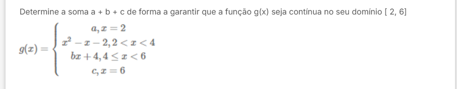 Determine a soma a + b + C de forma a garantir que a função g(x) seja no seu domínio [ 2, 6] V V g(x) =