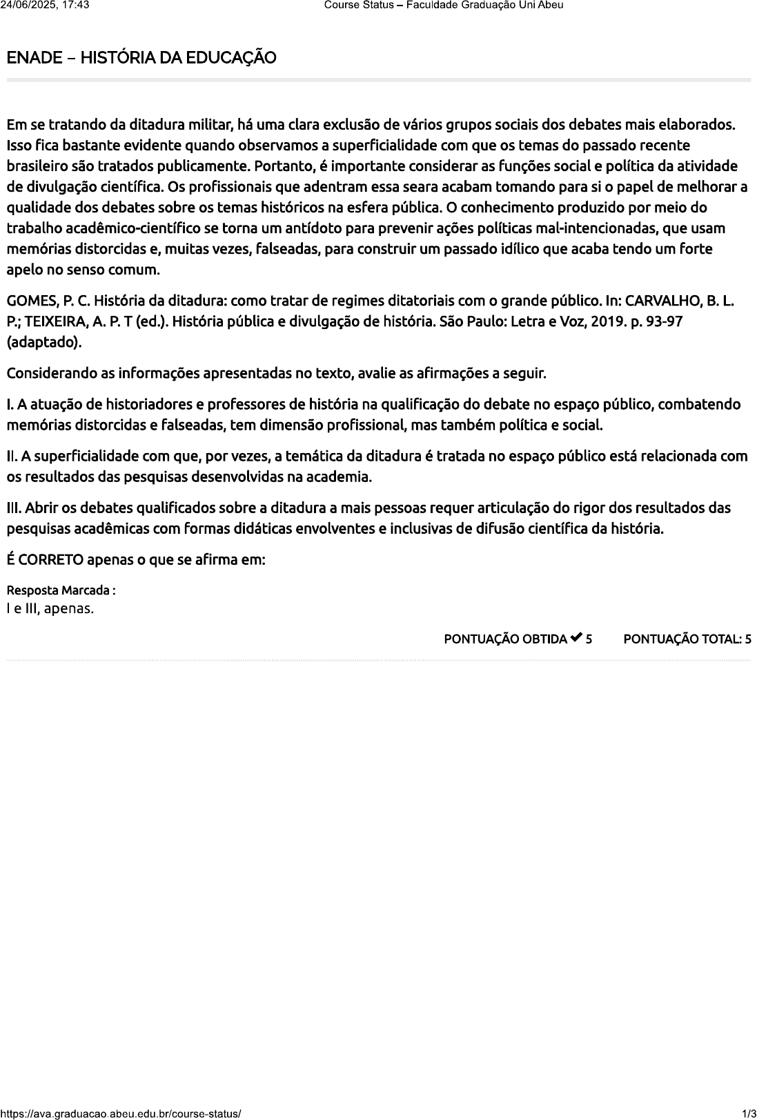 24/06/2025, 17:43 Course Status Faculdade Graduação Uni Abeu ENADE HISTÓRIA DA EDUCAÇÃO Em se tratando da ditadura militar, há uma clara exclusão de vários grupos sociais dos debates mais elaborados. Isso fica bastante evidente quando observamos a superficialidade com que os temas do passado recente brasileiro são tratados publicamente. Portanto, é importante considerar as funções social e política da atividade de divulgação científica. Os profissionais que adentram essa seara acabam tomando para si papel de melhorar a qualidade dos debates sobre os temas históricos na esfera pública. conhecimento produzido por meio do trabalho acadêmico-científico se torna um antídoto para prevenir ações políticas mal-intencionadas, que usam memórias distorcidas e, muitas vezes, falseadas, para construir um passado idílico que acaba tendo um forte apelo no senso comum. GOMES, P. História da ditadura: como tratar de regimes ditatoriais com grande público. In: CARVALHO, B. L. P.; TEIXEIRA, P. T (ed.). História pública e divulgação de história. São Paulo: Letra e Voz, 2019. p. 93-97 (adaptado). Considerando as informações apresentadas no texto, avalie as afirmações a seguir. I. A atuação de historiadores e professores de história na qualificação do debate no espaço público, combatendo memórias distorcidas e falseadas, tem dimensão profissional, mas também política e social. II. A superficialidade com que, por vezes, a temática da ditadura é tratada no espaço público está relacionada com os resultados das pesquisas desenvolvidas na academia. III. Abrir os debates qualificados sobre a ditadura a mais pessoas requer articulação do rigor dos resultados das pesquisas acadêmicas com formas didáticas envolventes e inclusivas de difusão científica da história. É CORRETO apenas que se afirma em: Resposta Marcada : I e III, apenas. PONTUAÇÃO OBTIDA 5 PONTUAÇÃO TOTAL: 5 1/324/06/2025, 17:43 Course Status Faculdade Graduação Uni Abeu Um inquérito que poderia ser apenas mais um entre os mais de 13 milhões de processos acumulados no arquivo judicial de um estado brasileiro e estava esquecido desde década de 1970 nas prateleiras de um acervo foi localizado por estudantes de História de uma universidade brasileira. documento trouxe à tona indícios de mais um falso suicídio cometido durante ditadura militar. A versão do suicídio agora é alvo da Comissão da Verdade. Passou a ser contestada com maior propriedade desde outubro de 2011, quando foi encontrado em meio milhares de papéis guardados por um tribunal de justiça. Deteriorado pela ação do tempo, inquérito foi restaurado por uma historiadora, e guardado com cuidado. Dias depois, passou pelo crivo de um professor de história e chegou ao conhecimento da Comissão de Mortos e Desaparecidos Políticos, que ajudou os pesquisadores no contato com familiares da vítima. Disponível Acesso em: 27 jun. 2020 (adaptado) Com base nas informações apresentadas sobre atuação profissional dos historiadores, avalie as afirmações seguir. I. As tomadas de decisão quanto à preservação e publicização de arquivos e, por consequência, construção de seu valor cultural e histórico, competem aos historiadores. II. trabalhar em arquivos, os historiadores devem conhecer legislação arquivística e ser capacitados para compreender os princípios e práticas da Arquivologia. III. Ao integrar equipes de difusão cultural, os historiadores possibilitam conhecimento de acervos e de documentos, garantindo o direito de acesso à informação como exercício da cidadania. É correto que se afirma em Resposta Marcada : e III, apenas. PONTUAÇÃO OBTIDA 5 PONTUAÇÃO TOTAL: 5 A "invenção" patrimonial se inscreve em um campo político em que memórias são disputadas, conforme os projetos políticos em pauta, em um processo que necessita ser pensado para que própria noção de patrimônio possa então ser desnaturalizada. essa discussão, os historiadores têm dado contribuições significativas. GUILLEN, I. Patrimônio e história: reflexões sobre papel do historiador. Diálogos, Maringá, V. 18, n. 2, 638, maio-ago. 2014 (adaptado). Considerando as referidas contribuições à discussão sobre patrimônio cultural, assinale a opção que apresenta principal papel do historiador nesse debate interdisciplinar. Resposta Marcada Problematizar as narrativas construídas em torno da identidade nacional em sua relação com patrimônio, discutindo as justificativas criadas para sua constituição. PONTUAÇÃO OBTIDA 5 PONTUAÇÃO TOTAL: 5 2/324/06/2025, 17:43 Course Status Faculdade Graduação Uni Abeu TEXTO I A educação de adultos torna-se mais que um direito: é a chave para século XXI, é tanto consequência do exercício da cidadania como condução para uma plena participação na sociedade. A educação de adultos pode modelar a identidade do cidadão e dar um significado à sua vida. SESI; UNESCO. Declaração de Hamburgo: agenda para futuro. Brasília, 1999, p. 89. Conferência Internacional sobre Educação de Adultos, 1997, Hamburgo, Alemanha. TEXTO Historicamente, Educação de Jovens e Adultos, no cenário brasileiro, surge da parceria dos movimentos sociais e das práticas comunitárias que buscam formas de emancipação e libertação da maioria da população, diante das diferentes maneiras e processos de exploração e submissão histórico-social. Buscou-se isto no grupos populares em círculos de cultura, utilizando-se alfabetização e a reflexão, que apresentavam um eixo comum: discussão dos determinantes conjunturais e estruturais que eram responsáveis pelas relações de exclusão e opressão em que vivia a maioria da população. FREITAS, F. Q. Educação de jovens e adultos, educação popular e processos de conscientização: interseções na vida cotidiana. Dossiê Educação de jovens: novos diálogos frente às dimensões contextuais contemporâneas. Educ. ver. (29), 2007 (a