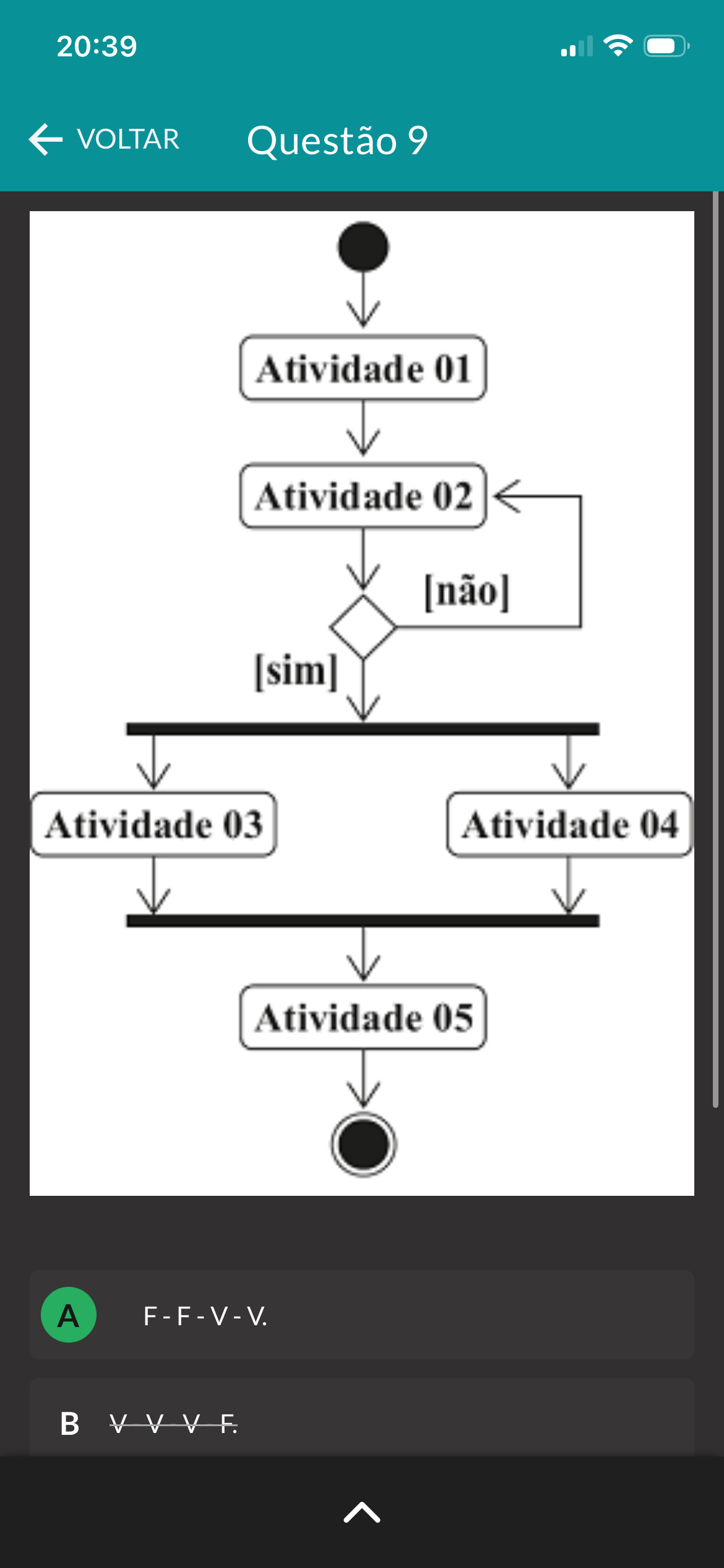 20:39 VOLTAR Questão 9 Atividade 01 Atividade 02 [não] [sim] Atividade 03 Atividade 04 Atividade 05 A F-F-V-V. B