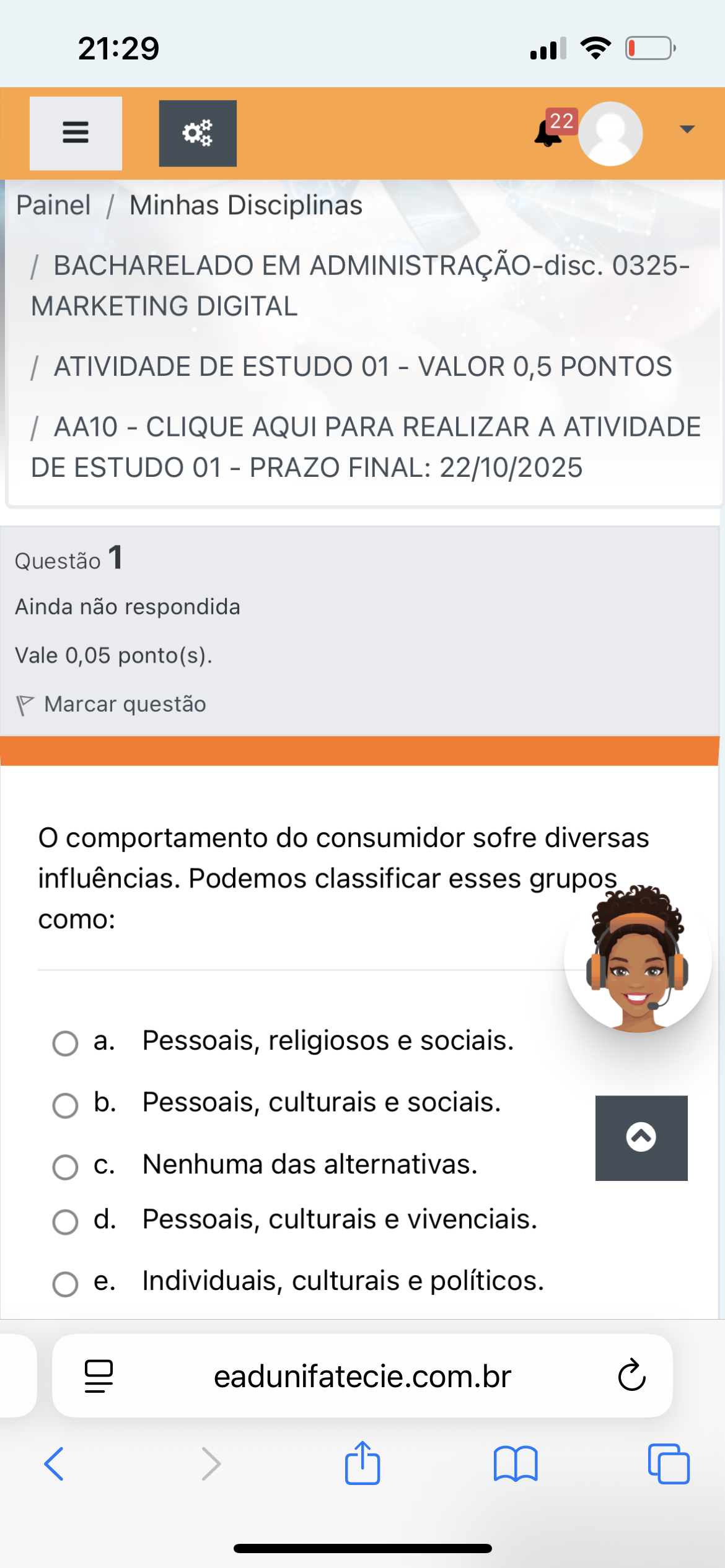 21:29 22 Painel / Minhas Disciplinas / BACHARELADO EM ADMINISTRAÇÃO-disc. 0325- MARKETING DIGITAL / ATIVIDADE DE ESTUDO 01 - VALOR 0,5 PONTOS / AA10 - CLIQUE AQUI PARA REALIZAR A ATIVIDADE DE ESTUDO 01 - PRAZO FINAL: 22/10/2025 Questão 1 Ainda não respondida Vale 0,05 ponto(s). Marcar questão O comportamento do consumidor sofre diversas influências. Podemos classificar esses grupos como: a. Pessoais, religiosos e sociais. b. Pessoais, culturais e sociais. Nenhuma das alternativas. d. Pessoais, culturais e vivenciais. e. Individuais, culturais e políticos. Oli eadunifatecie.com.br
