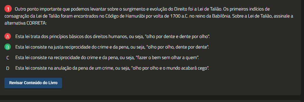 1 Outro ponto importante que podemos levantar sobre 0 surgimento e evolução do Direito foi a Lei de Talião. Os primeiros indícios de consagração da Lei de Talião foram encontrados no Código de Hamurábi por volta de 1700 a.C. no reino da Babilônia. Sobre a Lei de Talião, assinale a alternativa CORRETA: A Esta lei trata dos princípios básicos dos direitos humanos, ou seja, "olho por dente e dente por olho". Esta lei consiste na justa reciprocidade do crime e da pena, ou seja, "olho por olho, dente por dente". Esta lei consiste na reciprocidade do crime e da pena, ou seja, "fazer bem sem olhar a quem". D Esta lei consiste na anulação da pena de um crime, ou seja, "olho por olho e 0 mundo acabará cego". Revisar Conteúdo do Livro