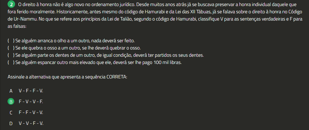 2 0 direito à honra não é algo novo no ordenamento jurídico. Desde muitos anos atrás já se buscava preservar a honra individual daquele que fora ferido moralmente. Historicamente, antes mesmo do código de Hamurabi e da Lei das XII Tábuas, já se falava sobre 0 direito à honra no Código de Ur-Nammu. No que se refere aos princípios da Lei de Talião, segundo 0 código de Hamurabi, classifique V para as sentenças verdadeiras e F para as falsas: ( ) Se alguém arranca 0 olho a um outro, nada deverá ser feito. ( ) Se ele quebra 0 OSSO a um outro, se lhe deverá quebrar 0 ( ) Se alguém parte dentes de um outro, de igual condição, deverá ter partidos seus dentes. ( ) Se alguém espancar outro mais elevado que ele, deverá ser lhe pago 100 mil libras. Assinale a alternativa que apresenta a sequência CORRETA: A V-F-F-V. F-V-V-F. F-F-V-V. D V-V-F-V.