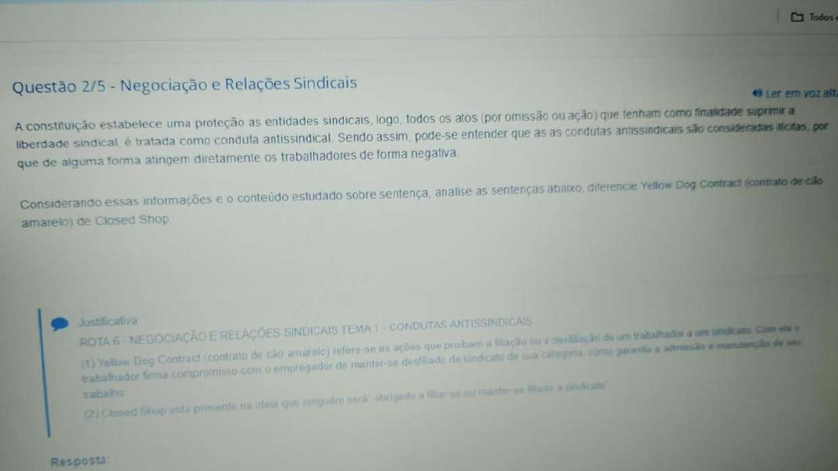 Todos Questão 2/5 Negociação e Relações Sindicais Ler em voz alta A constituição estabelece uma proteção as entidades sindicais, logo, todos atos (por omissão ou ação) que tenham como finalidade suprimir a liberdade é tratada como conduta antissindical. Sendo assim, pode-se entender que as as condutas antissindicais são consideradas por que de alguma forma atingem diretamente os trabalhadores de forma Considerando essas informações e conteúdo estudado sobre sentença, analise as sentenças abaixo, diferencie Yellow Dog Contract (contrato de amarelo) de Closed Shop Justificativa ROTA 6 NEGOCIAÇÃO E RELAÇÕES SINDICAIS TEMA 1 CONDUTAS ANTISSINDICAIS filiação de trabalhador um - um (1) trabalhador Yellow Dog firma Contract compromisso (contrato com de cão empregador amarelo) refere-se de manter-se as ações que de sindicato a de sua ou categoria garantia admissão de trabalho (2) Closed Shop presente idela que ninguém obrigado a fillar-se ouConfirme sua identidade Todos os favoritos = seu compartilhamento infringe as políticas do Centro Universitário UNINTER e poderá implicar sanções com possibilidade de desligamento do quadro de alunos do Centro Universitário, bem como responder ações judiciais no âmbito civel e criminal. Questão 1/5 Negociação e Relações Sindicais Ler em alta têm como finalidade defender os interesses de profissões ou atividades, e não apenas de empregados foi e empregadores, se moldando ao nos longo estreitos do limites Os da relação sindicatos de trabalho stricto Todavia, é importante entender que 0 sindicato é uma construção histórica que Considerando essas informações e conteúdo estudado sobre histórico do sindicalismo pelo mundo, explique 0 que são guildas da Idade explicando se existe alguma semelhança com as entidades sindicais da atualidade Justificativa ROTA 2 NEGOCIAÇÃO como finalidade E RELAÇÕES defender SINDICAIS 05 interesses Tema de seus HISTORICO DO SINDICALISMO podem PELO considerados MUNDO uma entidade esse instituto tem Os uma guildas semelhança maior com Conselhos de Classe atualidade Resposta: MmTodos Questão 4/5 Negociação e Relações Sindicais Ler em voz alt como vimos, a própria Constituição de 1988, impõe alguns limites ao direito de greve. primeiro deles, está previsto no art. 9°, parágrafo "A lei definirá serviços ou atividades essenciais e disporá sobre 0 atendimento das necessidades inadiáveis da comunidade" (Brasil, 1988). Dessa forma, greve não pode abranger atividades que têm caráter de essencialidade para funcionamento da A esse respeito, apresente três serviços considerados essenciais, conforme lei supramencionada. n 7 distribuição e comercialização de medicamentos processamento e em seu art. 10. dispõe dessas atividades: e abastecimento de e alimentos produção e distribuição transporte de energia elétrica, captação gás e de assistência esgoto médica hospitalar: guarda, e controle de substâncias bancária equipamentos e materiais de tratamento dados ligados a serviços controle de tráfego aéreo: compensação Resposta: NmmConfirme sua identidade Todos favoritos Questão 5/5 Negociação e Relações Sindicais Ler em voz alta são preceitos que norteiam sistema jurídico, os principios servem de base, são essenciais para 0 desenvolvimento uniformização da área cujo da qual justiça estão no Os inseridos, princípios ou seja, é 0 impulso dado a alguma coisa, base, fundamento ou causa primária. Por meio dos principios existe uma caso concreto. Considerando essas informações e conteúdo estudado sobre principios, explique principio da razoabilidade na negociação coletiva. ROTA 4 NEGOCIAÇÃO da Razoabilidade 0 bom senso equilibrio devem ser na negociação podendo haver reinvindicações que não dos possuam E RELAÇÕES SINDICAIS TEMA 4 ETAPAS E DA NEGOCIAÇÃO coletiva, não COLETIVA condições principio principio de da serem Participação atendidas obrigatória das entidades sindicais De acorde com inc. da Constituição de è a participação 0 sindicatos nas negociações coletivas de trabalho" Resposta: MmmnTodos os Questão 3/5 Negociação e Relações Sindicais Ler em alta Com a promulgação da Reforma Trabalhista, pelo então Presidente da República Michel Temer, no dia 13 de de com a Lei modificou-se consideravelmente a As modificações da lei trabalhista uma no sentido de futuro, visto que muitos pontos aparentemente podem ser considerados um Considerando essas informações e 0 conteúdo estudado sobre considerações sobre a lei 13.467/17 cite pelo menos uma de direito dos trabalhadores com a nova lei em Justificativa ROTA 6 NEGOCIAÇÃO E RELAÇÕES SINDICAIS TEMA 2 CONSIDERAÇÕES 13.467/17 As férias que poderiam ser divididas em 2 agora com a reforma pode ser parcelas em 3. prazo mínimo de afastamento de 5 dias maior tem que ser de mais de 14 a lei não mencionava dispositivo sobre home office agora se manifesta sobre Em relação ao este que era de 1 hora 0 no 2 horas de empregado que trabalhava por mais de 6 horas passou a ser desde que no minimo 30 assim tempo no permitindo que possa 0 trabalho mais A jornada de trabalho que era em 44 horas semanais 220 horas mensais podendo 2 extras por dia, foi modificada para 12 horas diárias com 36 horas de respeitando fixação de 44 semanais e 220 horas sendo que, tal escala poderia ser feita mediante acordo ou negociação coletiva em relação a categorias Durante 0 de gravidez a gestante deveria ser de atividades insalubres somente será afastada se a insalubridade for de grau máximo Na reforma, tempo de deslocamento do ainda que local de seja de dificil acesso, de ser considerado de assim como 0 tempo relativo a troca de uniforme e POR 15:46 40) PTB2 22/10/2025