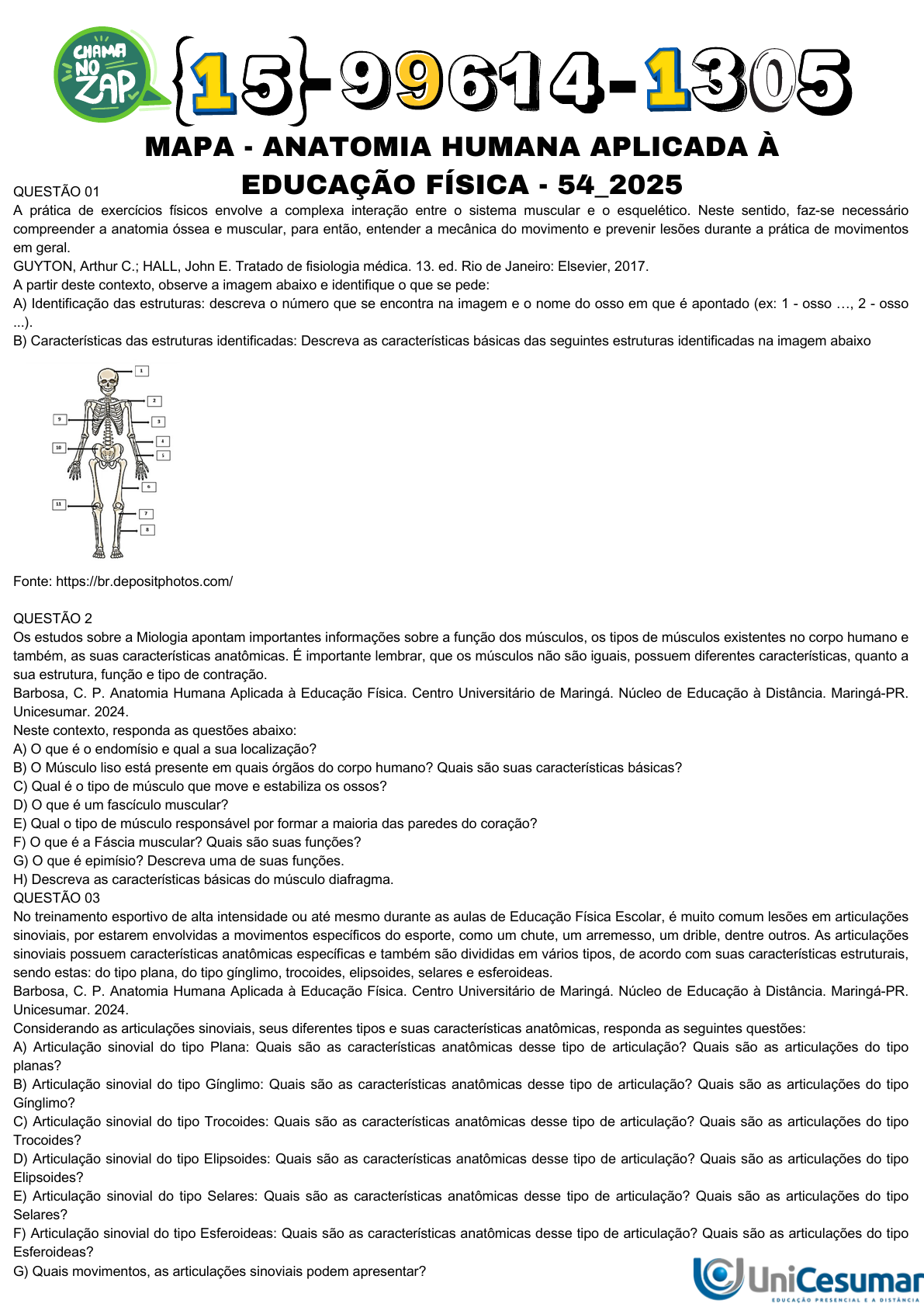 QUESTÃO 01 A prática de exercícios físicos envolve a complexa interação entre o sistema muscular e o esquelético. Neste sentido, faz-se necessário compreender a anatomia óssea e muscular, para então, entender a mecânica do movimento e prevenir lesões durante a prática de movimentos em geral. GUYTON, Arthur C.; HALL, John E. Tratado de fisiologia médica. 13. ed. Rio de Janeiro: Elsevier, 2017. A partir deste contexto, observe a imagem abaixo e identifique o que se pede: A) Identificação das estruturas: descreva o número que se encontra na imagem e o nome do osso em que é apontado (ex: 1 - osso …, 2 - osso ...). B) Características das estruturas identificadas: Descreva as características básicas das seguintes estruturas identificadas na imagem abaixo MAPA - ANATOMIA HUMANA APLICADA À EDUCAÇÃO FÍSICA - 54_2025 - - Fonte: https://br.depositphotos.com/ QUESTÃO 2 Os estudos sobre a Miologia apontam importantes informações sobre a função dos músculos, os tipos de músculos existentes no corpo humano e também, as suas características anatômicas. É importante lembrar, que os músculos não são iguais, possuem diferentes características, quanto a sua estrutura, função e tipo de contração. Barbosa, C. P. Anatomia Humana Aplicada à Educação Física. Centro Universitário de Maringá. Núcleo de Educação à Distância. Maringá-PR. Unicesumar. 2024. Neste contexto, responda as questões abaixo: A) O que é o endomísio e qual a sua localização? B) O Músculo liso está presente em quais órgãos do corpo humano? Quais são suas características básicas? C) Qual é o tipo de músculo que move e estabiliza os ossos? D) O que é um fascículo muscular? E) Qual o tipo de músculo responsável por formar a maioria das paredes do coração? F) O que é a Fáscia muscular? Quais são suas funções? G) O que é epimísio? Descreva uma de suas funções. H) Descreva as características básicas do músculo diafragma. QUESTÃO 03 No treinamento esportivo de alta intensidade ou até mesmo durante as aulas de Educação Física Escolar, é muito comum lesões em articulações sinoviais, por estarem envolvidas a movimentos específicos do esporte, como um chute, um arremesso, um drible, dentre outros. As articulações sinoviais possuem características anatômicas específicas e também são divididas em vários tipos, de acordo com suas características estruturais, sendo estas: do tipo plana, do tipo gínglimo, trocoides, elipsoides, selares e esferoideas. Barbosa, C. P. Anatomia Humana Aplicada à Educação Física. Centro Universitário de Maringá. Núcleo de Educação à Distância. Maringá-PR. Unicesumar. 2024. Considerando as articulações sinoviais, seus diferentes tipos e suas características anatômicas, responda as seguintes questões: A) Articulação sinovial do tipo Plana: Quais são as características anatômicas desse tipo de articulação? Quais são as articulações do tipo planas? B) Articulação sinovial do tipo Gínglimo: Quais são as características anatômicas desse tipo de articulação? Quais são as articulações do tipo Gínglimo? C) Articulação sinovial do tipo Trocoides: Quais são as características anatômicas desse tipo de articulação? Quais são as articulações do tipo Trocoides? D) Articulação sinovial do tipo Elipsoides: Quais são as características anatômicas desse tipo de articulação? Quais são as articulações do tipo Elipsoides? E) Articulação sinovial do tipo Selares: Quais são as características anatômicas desse tipo de articulação? Quais são as articulações do tipo Selares? F) Articulação sinovial do tipo Esferoideas: Quais são as características anatômicas desse tipo de articulação? Quais são as articulações do tipo Esferoideas? G) Quais movimentos, as articulações sinoviais podem apresentar? https://www.instagram.com/excellenceeducacional/p/DG1XaOaREOS/ https://www.instagram.com/excellenceeducacional/p/DG1XaOaREOS/