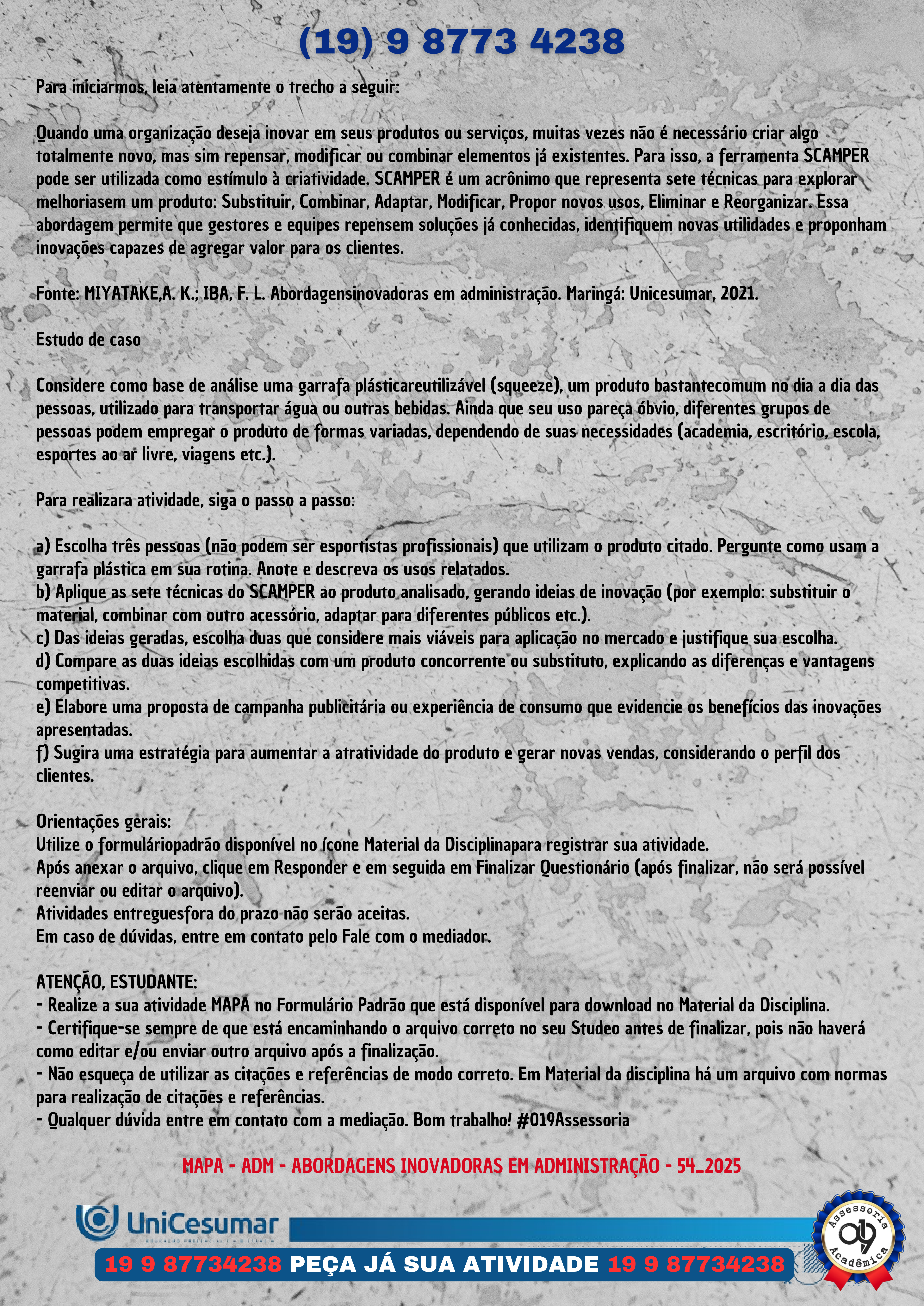 Para iniciarmos, leia atentamente o trecho a seguir: Quando uma organização deseja inovar em seus produtos ou serviços, muitas vezes não é necessário criar algo totalmente novo, mas sim repensar, modificar ou combinar elementos já existentes. Para isso, a ferramenta SCAMPER pode ser utilizada como estímulo à criatividade. SCAMPER é um acrônimo que representa sete técnicas para explorar melhoriasem um produto: Substituir, Combinar, Adaptar, Modificar, Propor novos usos, Eliminar e Reorganizar. Essa abordagem permite que gestores e equipes repensem soluções já conhecidas, identifiquem novas utilidades e proponham inovações capazes de agregar valor para os clientes. Fonte: MIYATAKE,A. K.; IBA, F. L. Abordagensinovadoras em administração. Maringá: Unicesumar, 2021. Estudo de caso Considere como base de análise uma garrafa plásticareutilizável (squeeze), um produto bastantecomum no dia a dia das pessoas, utilizado para transportar água ou outras bebidas. Ainda que seu uso pareça óbvio, diferentes grupos de pessoas podem empregar o produto de formas variadas, dependendo de suas necessidades (academia, escritório, escola, esportes ao ar livre, viagens etc.). Para realizara atividade, siga o passo a passo: a) Escolha três pessoas (não podem ser esportistas profissionais) que utilizam o produto citado. Pergunte como usam a garrafa plástica em sua rotina. Anote e descreva os usos relatados. b) Aplique as sete técnicas do SCAMPER ao produto analisado, gerando ideias de inovação (por exemplo: substituir o material, combinar com outro acessório, adaptar para diferentes públicos etc.). c) Das ideias geradas, escolha duas que considere mais viáveis para aplicação no mercado e justifique sua escolha. d) Compare as duas ideias escolhidas com um produto concorrente ou substituto, explicando as diferenças e vantagens competitivas. e) Elabore uma proposta de campanha publicitária ou experiência de consumo que evidencie os benefícios das inovações apresentadas. f) Sugira uma estratégia para aumentar a atratividade do produto e gerar novas vendas, considerando o perfil dos clientes. Orientações gerais: Utilize o formuláriopadrão disponível no ícone Material da Disciplinapara registrar sua atividade. Após anexar o arquivo, clique em Responder e em seguida em Finalizar Questionário (após finalizar, não será possível reenviar ou editar o arquivo). Atividades entreguesfora do prazo não serão aceitas. Em caso de dúvidas, entre em contato pelo Fale com o mediador. ATENÇÃO, ESTUDANTE: - Realize a sua atividade MAPA no Formulário Padrão que está disponível para download no Material da Disciplina. - Certifique-se sempre de que está encaminhando o arquivo correto no seu Studeo antes de finalizar, pois não haverá como editar e/ou enviar outro arquivo após a finalização. - Não esqueça de utilizar as citações e referências de modo correto. Em Material da disciplina há um arquivo com normas para realização de citações e referências. - Qualquer dúvida entre em contato com a mediação. Bom trabalho! #019Assessoria MAPA - ADM - ABORDAGENS INOVADORAS EM ADMINISTRAÇÃO - 54_2025 19 9 87734238 PEÇA JÁ SUA ATIVIDADE 19 9 87734238 (19) 9 8773 4238