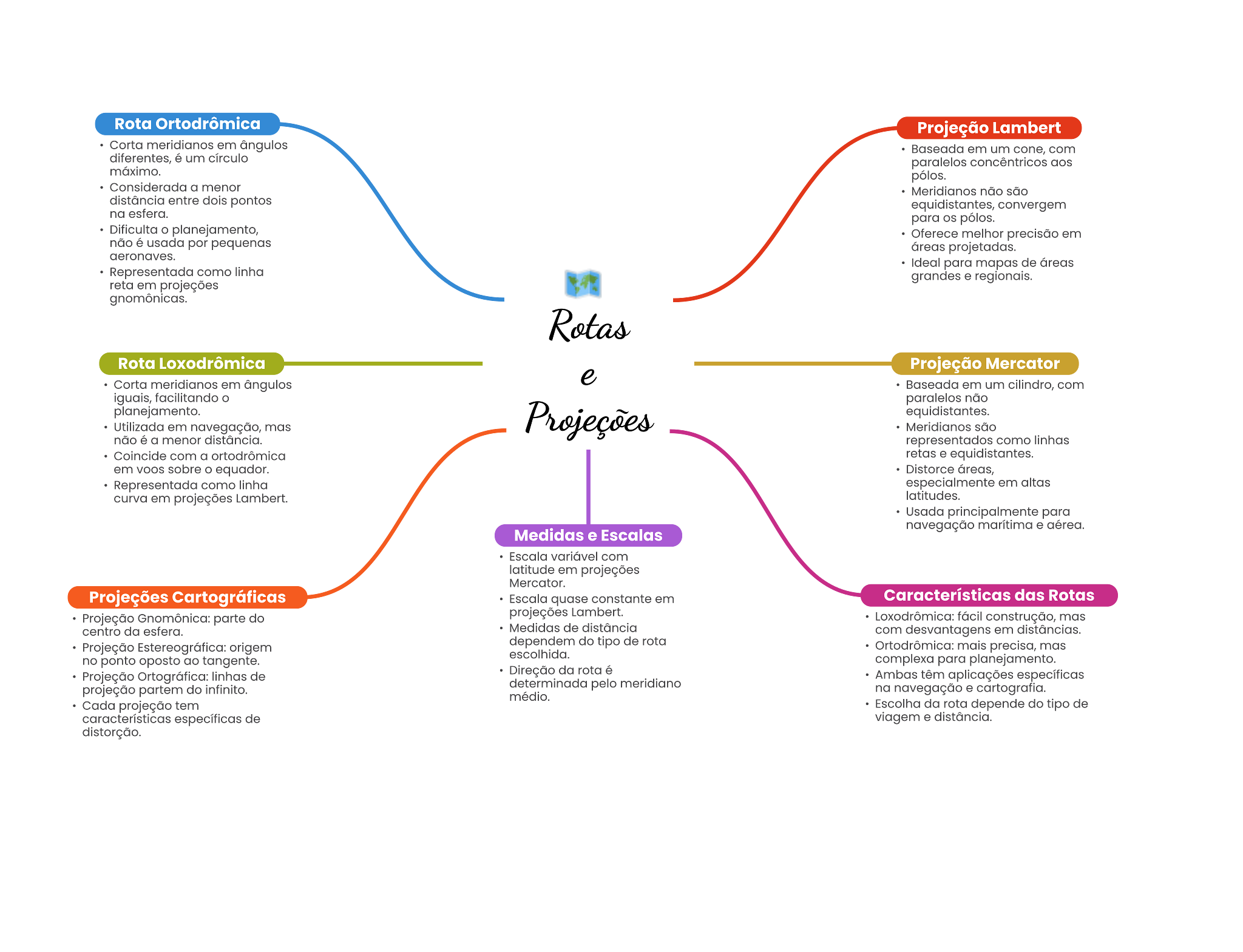 Rota Ortodrômica Projeção Lambert Corta em em um com diferentes, um paralelos concêntricos pólos. Considerada a menor não distância entre dols pontos convergem na esfera. para Dificulta melhor em não usada por pequenas para mapas de áreas Representada como grandes regionals. reta em projeções gnomônicas. Rota Loxodrômica Projeção Mercator Corta meridianos em Baseada em um com facilitando não equidistantes. Utilizada em são não a menor distância. representados como linhas com a ortodrômica em sobre equador. Distorce Representada como linha especialmente em curva em projeções Lambert. Usada para navegação maritima Medidas e Escalas Escala com latitude em projeções Mercator. Projeções Cartográficas Escala quase constante em Características das Rotas Projeção do projeções Lambert. construção, mas centro da de distância com em distâncias. Projeção origem dependem do tipo de rota Ortodrômica: mais mas escolhida. no ponto oposto complexa para Projeção Ortográfico: linhas de Direção da rota Ambas têm aplicações específicas projeção partem do determinada pelo na navegação . cartografia. médio. projeção tem Escolha da rota depende do tipo de específicas de . distância. distorção.