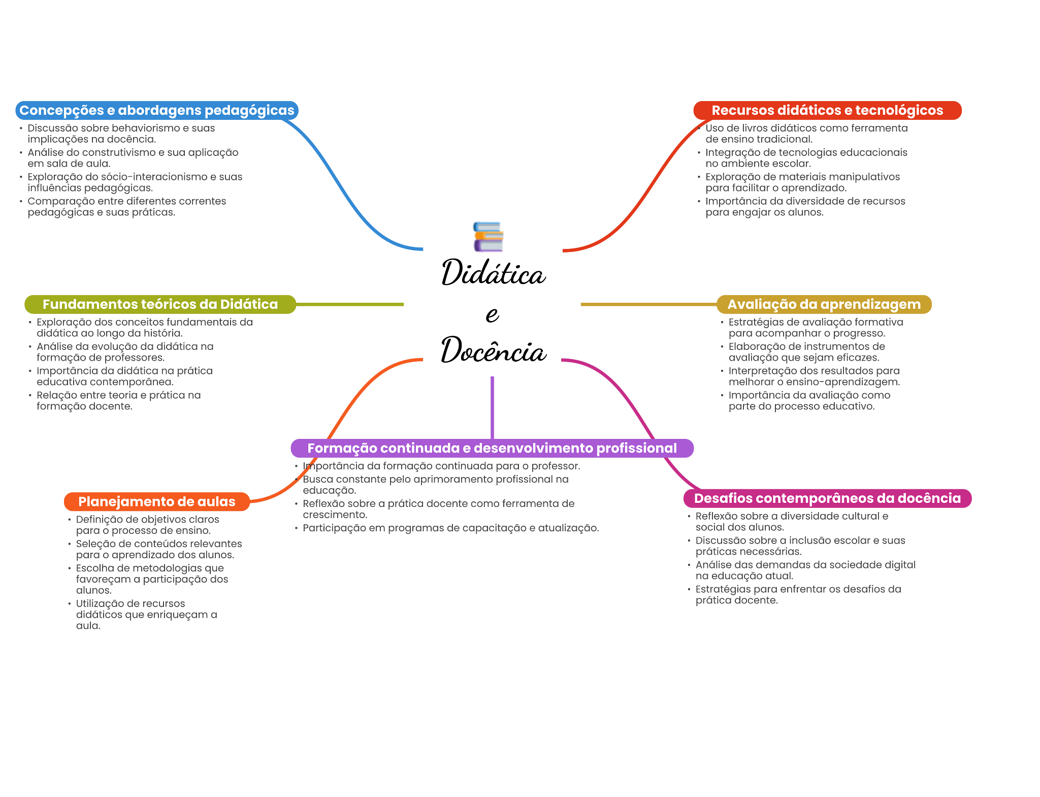 Concepções e abordagens pedagógicas Recursos didáticos e tecnológicos Discussão sobre . Uso de livroe como ferramento docência. de ensino tradicional. do construtivismo aplicação integração de tecnologias educacionale em sala de no ambiente escolar. Exploração do . Exploração de materials manipulativos para facilitar Comparação entre diferentes correntes importância da de recursos para engajar alunos. Fundamentos teóricos da Didática Avaliação da aprendizagem Exploração dos da Estratégias de avaliação formativa longo da história. para acompanhar progresso. da evolução da na de instrumentos de formação de professores. avaliação que sejam da na prática dos resultados para educativa Relação entre teoria prática na da avaliação como formação parte do processo educativo. Formação continuada e desenvolvimento profissional da formação continuada para o professor. Busca constante pelo aprimoramento na educação. Planejamento de aulas Reflexão sobre a docente como de Desafios contemporâneos da docência Definição de objetivos claros creacimento. sobre a cultural e para o processo de ensino. em programas de capacitação social dos alunos. Seleção de conteúdos relevantes Discussão sobre a escolar para aprendizado dos alunos. Escolha de metodologias que das demandas da sociedade digital favoreçam a participação na educação para enfrentar da Utilização de recursos prótica que enriqueçam a