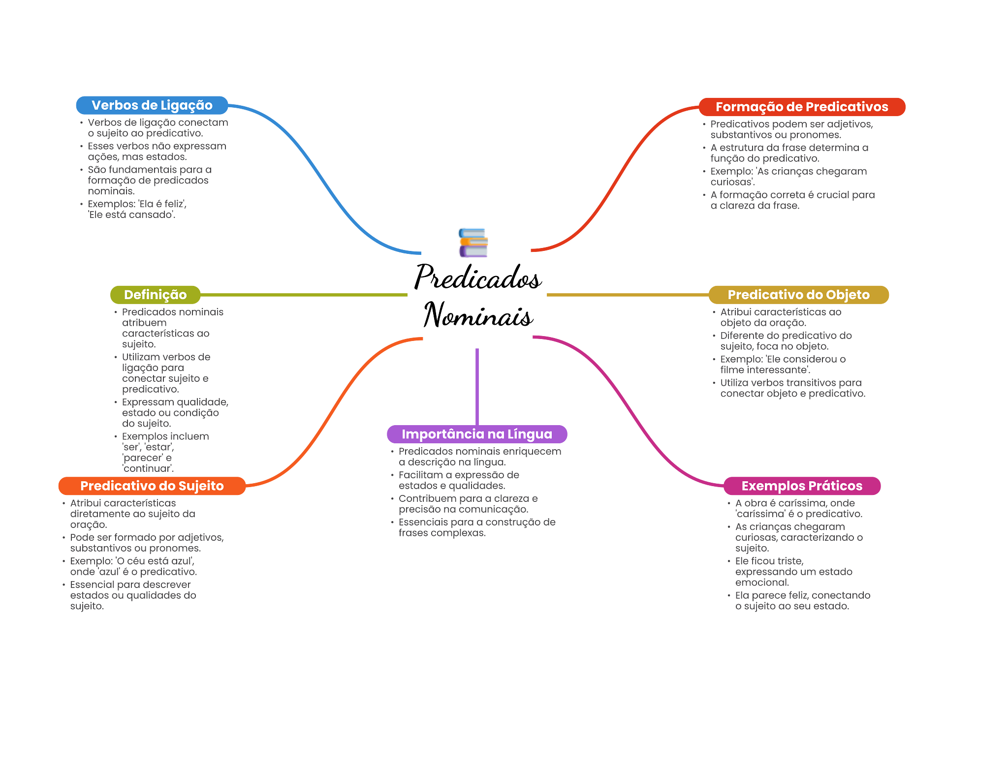 Verbos de Ligação Formação de Predicativos Verbos de ligação Predicativos podem ser adjetivos, sujeito predicativo. substantivos ou pronomes. Esses verbos não A estrutura da frase determina a mas estados. função do São fundamentale para a Exemplo: chegaram formação de predicados A formação correta crucial para Exemplos: a clareza da frase. está Definição Predicativo do Objeto Predicados Atribul atribuem objeto da oração. características Diferente do predicativo do foca no objeto. Utilizam verbos de Exemplo: considerou ligação para sujeito Utiliza verbos transitivos para predicativo. objeto predicativo. qualidade, estado ou condição do Exemplos Importância na Língua 'ser', 'parecer' Predicados enriquecem a descrição na lingua. Facilitam a expressão de Predicativo do Sujeito estados qualidades. Exemplos Práticos características Contribuem para a e A obra onde diretamente da na comunicação. predicativo. oração. para a construção de frases As crianças chegaram Pode formado por adjetivos, substantivos ou pronomes. sujeito. Exemplo: Be ficou onde predicativo. um estado Essencial para descrever emocional. estados ou qualidades do sujeito seu estado.