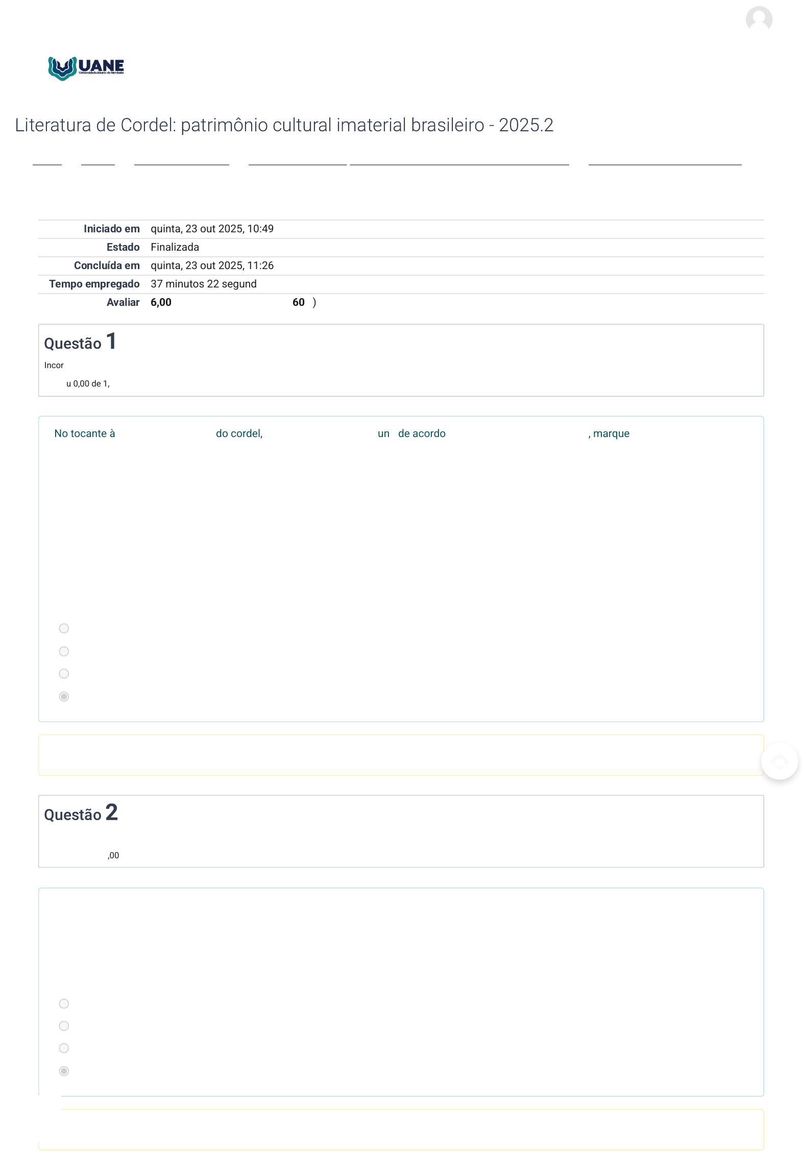 Painel / Cursos / Cursos de Extensão / Literatura de Cordel: patrimônio cultural imaterial brasileiro - 2025.2 / Atividade Avaliativa do Curso 01 Literatura de Cordel: patrimônio cultural imaterial brasileiro - 2025.2 Iniciado em quinta, 23 out 2025, 10:49 Estado Finalizada Concluída em quinta, 23 out 2025, 11:26 Tempo empregado 37 minutos 22 segundos Avaliar 6,00 de um máximo de 10,00(60%) Questão 1 Incorreto Atingiu 0,00 de 1,00 Questão 2 Correto Atingiu 1,00 de 1,00 No tocante à autoria de clássicos do cordel, relacione a segunda coluna de acordo com a primeira e, em seguida, marque a sequência correta: 1. O cachorro dos mortos 2. O capitão do navio 3. Os martírios de Genoveva ( ) Silvino Pirauá de Lima ( ) José Galdino da Silva Duda ( ) Leandro Gomes de Barros. Marque a opção que contém a sequência correta de cima para baixo da segunda coluna. Escolha uma opção: a. 1, 3, 2 b. 1, 2, 3 c. 2, 3, 1 d. 2, 1, 3 A resposta correta é: 2, 3, 1 No dia 19 de setembro de ________, _______, a literatura de cordel foi reconhecida como Patrimônio ________ Brasileiro pelo Instituto do Patrimônio Histórico e ________ Nacional – IPHAN. Assinale a alternativa que completa corretamente as lacunas do texto acima. Escolha uma opção: a. 2020, na Paraíba, Narrativo, Antropológico b. 2019, em Brasília, Comercial, Analítico c. 2017, em São Paulo, Literário, Autônomo d. 2018, no Rio de Janeiro, Cultural, Artístico A resposta correta é: 2018, no Rio de Janeiro, Cultural, Artístico Sueli Almeida da … https://cursos.fdr.org.br/my/ https://cursos.fdr.org.br/course/index.php https://cursos.fdr.org.br/course/index.php?categoryid=2 https://cursos.fdr.org.br/course/view.php?id=279 https://cursos.fdr.org.br/mod/quiz/view.php?id=11814 https://cursos.fdr.org.br/ https://cursos.fdr.org.br/ https://cursos.fdr.org.br/ https://cursos.fdr.org.br/ https://cursos.fdr.org.br/ Questão 3 Correto Atingiu 1,00 de 1,00 Questão 4 Correto Atingiu 1,00 de 1,00 Questão 5 Correto Atingiu 1,00 de 1,00 Qual das duplas de poetas a seguir publicou cordéis antes de Leandro Gomes de Barros, considerado o pai do cordel brasileiro? Escolha uma opção: a. Anastacio Lopes da Silva Trovoada e Maria das Neves Batista Pimentel b. João Martins de Athayde e João Santana de Maria c. Maria das Neves Batista Pimentel e Chagas Batista d. João Santana de Maria e Anastacio Lopes da Silva Trovoada A resposta correta é: João Santana de Maria e Anastacio Lopes da Silva Trovoada Qual dupla de cordelistas a seguir estiveram diretamente envolvidos na criação da editora Tupynaquim e da coleção temática “Cancão de Fogo”, iniciativas que foram fundamentais para o ressurgimento do cordel depois de um período de grande preocupação, no qual a antiga Tipografia São Francisco fechou as portas? Escolha uma opção: a. Klévisson Viana e Arievalo Viana b. Stélio Torquato Lima e Paulo de Tarso c. Evaristo Geraldo e Godofrêdo Solón d. Rouxinol do Rinaré e Evaristo Geraldo A resposta correta é: Klévisson Viana e Arievalo Viana Quem é considerado o maior poeta-repórter brasileiro de todos os tempos? Escolha uma opção: a. Leandro Gomes de Barros b. Chagas Batista c. José Francisco Soares d. João Martins de Athayde A resposta correta é: José Francisco Soares Sueli Almeida da … https://cursos.fdr.org.br/ https://cursos.fdr.org.br/ https://cursos.fdr.org.br/ https://cursos.fdr.org.br/ https://cursos.fdr.org.br/ Questão 6 Correto Atingiu 1,00 de 1,00 Questão 7 Incorreto Atingiu 0,00 de 1,00 Questão 8 Correto Atingiu 1,00 de 1,00 Segundo a historiadora Ruth Terra, “o simbólico e o ________, nesta literatura [o cordel], também são constitutivos do ________, daí permitir-se o poeta povoar com a tradição o ________, fazendo emergir narrativas ________ que se informam no âmbito desta mesma tradição.” (1983). Assinale a alternativa que completa corretamente as lacunas do texto acima. Escolha uma opção: a. Imaginário; real; cotidiano; de lutas b. Real; sonho; literário; das secas c. Absurdo; romance; sonho; de pelejas d. Non sense; cotidiano; Centro-oeste; de humor A resposta correta é: Imaginário; real; cotidiano; de lutas Qual dos poetas abaixo trabalhou na Tipografia São Francisco, de propriedade do alagoano José Bernardo da Silva? Escolha uma opção: a. Expedito Sebastião da Silva b. Cuíca de Santo Amaro c. José Soares d. Minelvino Francisco Silva A resposta correta é: Expedito Sebastião da Silva Sobre a circulação da literatura de cordel no Brasil, antes de Leandro Gomes de Barros, assinale V para Verdadeiro, e F para Falso. ( ) Santaninha, poeta-repórter do tempo do Império, nasceu na Bahia e viveu em São Paulo. ( ) Sílvio Romero informou que, no Rio de Janeiro, podiam ser encontrados cordéis como A história da donzela Teodora, A imperatriz Porcina, A formosa Magalona e O naufrágio de João de Calais. ( ) Em 1865, foi publicado no Recife o folheto O testamento do macaco. ( ) O folheto português O testamento do galo inspirou-se no folheto brasileiro O testamento do macaco. A alternativa que contém a resposta correta, observando a sequência de cima para baixo, é: Escolha uma opção: a. V, F, F, V b. F, V, V, V c. V, V, V, F d. F, V, V, F A resposta correta é: F, V, V, F Sueli Almeida da … https://cursos.fdr.org.br/ https://cursos.fdr.org.br/ https://cursos.fdr.org.br/ https://cursos.fdr.org.br/ https://cursos.fdr.org.br/ Questão 9 Incorreto Atingiu 0,00 de 1,00 Questão 10 Incorreto Atingiu 0,00 de 1,00 Nos anos 1930, Maria das Neves Batista Pimentel surge como pioneira na publicação de cordéis de autoria feminina, destacando-se na adaptação de obras clássicas, entre as quais se incluiu: Escolha uma opção: a. O corcunda de Notre-Dame, de Victor Hugo. b. D. Quixote, de Miguel de Cervantes. c. Madame Bovary, de Gustave Flaubert. d. A volta ao mundo em oitenta dias, de Julio Verne. A resposta correta é: O corcunda de Notre-Dame, de Victor Hugo. Leia atent