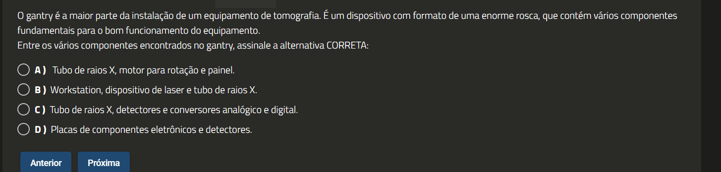 0 gantry é a maior parte da instalação de um equipamento de tomografia. É um dispositivo com formato de uma enorme rosca, que contém vários componentes fundamentais para 0 bom funcionamento do equipamento. Entre vários componentes encontrados no gantry, assinale a alternativa CORRETA: A) Tubo de raios X, motor para rotação e painel. B) Workstation, dispositivo de laser e tubo de raios X. C) Tubo de raios X, detectores e conversores analógico e digital. D) Placas de componentes eletrônicos e detectores. Anterior Próxima
