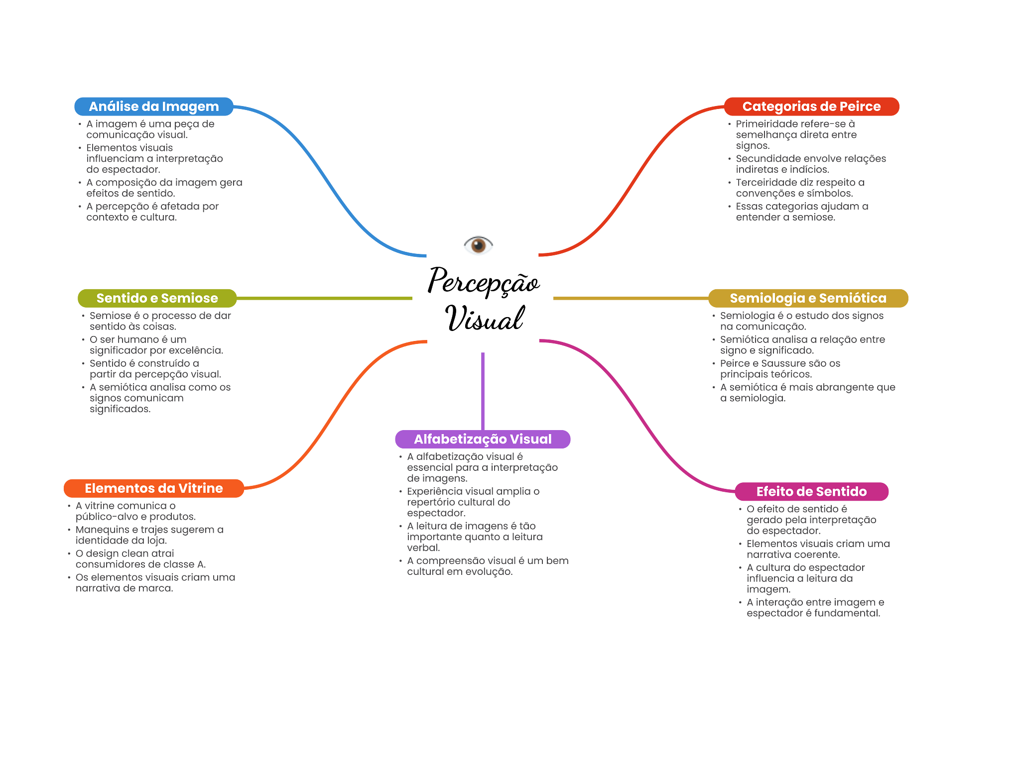 Análise da Imagem Categorias de Peirce A uma peça de Primeiridade refere-se comunicação visual. direta entre Elementos influenciam a Secundidade envolve relações do espectador. A composição da gera Terceiridade diz respeito a de sentido. convenções simbolos. A percepção é afetada por categorias a contexto cultura. entender a Sentido e Semiose Semiologia e Semiótica o processo de dar Semiologia é estudo dos signos sentido na comunicação. ser humano é um a relação entre significador por excelência. signo significado. Sentido construído a Peirce partir da principate A semiótica como A semiótica abrangente que comunicam a semiologia. significados. Alfabetização Visual A visual . essencial para a interpretação de Elementos da Vitrine Experiência visual amplia Efeito de Sentido A vitrine comunica cultural do espectador. de sentido público-alvo produtos. . trajes a A leitura de tão pela interpretação da loja. quanto a leitura do espectador. verbal. Elementos visuale criam uma design clean atrai narrativa cosrents. consumidores de classe A. A visual um bem cultural em evolução. A cultura do espectador Os elementos criam uma influencia a leitura da narrativa de marca. imagem. A interação entre imagem espectador fundamental.