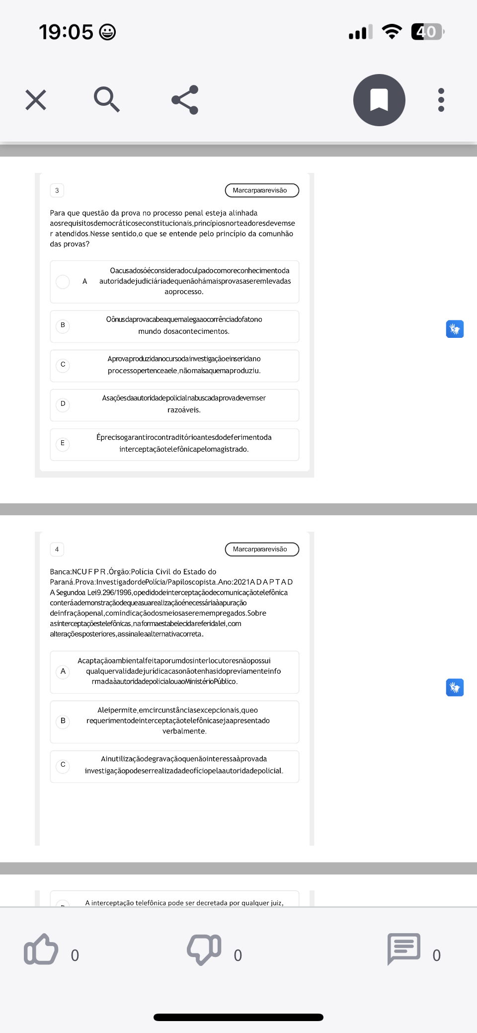 19:05 40 X 3 Marcarpararevisão Para que questão da prova no processo penal esteja alinhada r Nesse sentido,o que se entende pelo princípio da comunhão das provas? A aoprocesso. mundo C D razoáveis. E 4 Marcarpararevisão Banca:NCU PR Civil do Estado do P T A D A Segundoa Acaptaçãoambientalfeitaporumdosinterlocutoresnãopossui A B C A interceptação telefônica pode ser decretada por qualquer juiz, 0 0 0