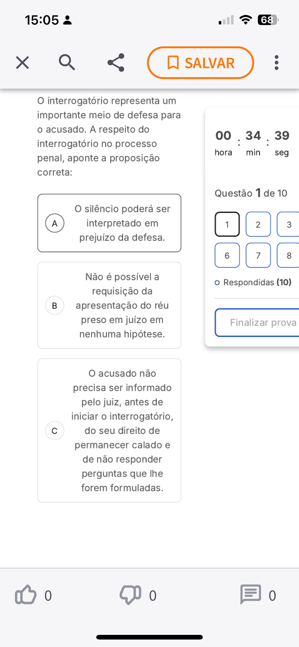 15:05 68 X SALVAR interrogatório representa um importante meio de defesa para acusado. A respeito do interrogatório no processo 00 : 34 : 39 hora min seg penal, aponte a proposição correta: Questão 1 de 10 silêncio poderá ser A interpretado em 1 2 3 prejuízo da defesa. 6 7 8 Não é possível a Respondidas (10) requisição da apresentação do réu preso em juízo em Finalizar prova nenhuma hipótese. acusado não precisa ser informado pelo juiz, antes de iniciar o interrogatório, do seu direito de permanecer calado e de não responder perguntas que lhe forem formuladas. 0 0 0
