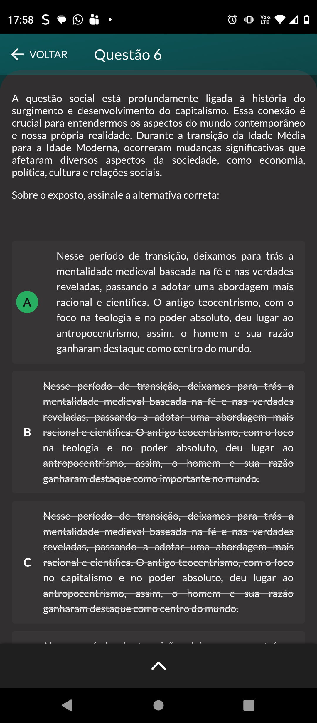 17:58 S LTE VOLTAR Questão 6 A questão social está profundamente ligada à história do surgimento e desenvolvimento do capitalismo. Essa conexão é crucial para entendermos os aspectos do mundo contemporâneo e nossa própria realidade. Durante a transição da Idade Média para a Idade Moderna, ocorreram mudanças significativas que afetaram diversos aspectos da sociedade, como economia, política, cultura e relações sociais. Sobre o exposto, assinale a alternativa correta: Nesse período de transição, deixamos para trás a mentalidade medieval baseada na fé e nas verdades reveladas, passando a adotar uma abordagem mais A racional e científica. antigo teocentrismo, com o foco na teologia e no poder absoluto, deu lugar ao antropocentrismo, assim, homem e sua razão ganharam destaque como centro do mundo. Nesse período de transição, deixamos para trás a mentalidade medieval baseada na fé e nas verdades reveladas, passando a adotar uma abordagem mais racional e científica. antigo teocentrismo, com foco na teologia e no poder absoluto, deu lugar ao antropocentrismo, assim, homem e sua razão ganharam destaque como importante no mundo. Nesse período de transição, deixamos para trás a mentalidade medieval baseada na fé e nas verdades reveladas, passando a adotar uma abordagem mais c racional e científica. antigo teocentrismo, com foco no capitalismo e no poder absoluto, deu lugar ao antropocentrismo, assim, homem e sua razão ganharam destaque como centro do mundo.