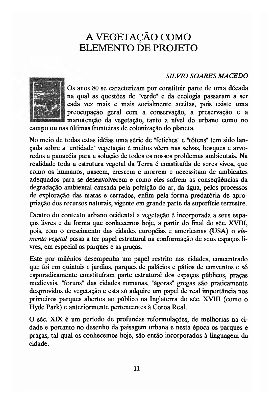 A VEGETAÇÃO COMO ELEMENTO DE PROJETO SILVIO SOARES MACEDO Os anos 80 se caracterizam por constituir parte de uma década na qual as questões do "verde" e da ecologia passaram a ser cada vez mais e mais socialmente aceitas, pois existe uma preocupação geral com a conservação, a preservação e a manutenção da vegetação, tanto a nível do urbano como no campo ou nas últimas fronteiras de colonização do planeta. No meio de todas estas idéias uma série de "fetiches" e "totens" tem sido lan çada sobre a "entidade" vegetação e muitos vêem nas selvas, bosques e arvo redos a panacéia para a solução de todos os nossos problemas ambientais. Na realidade toda a estrutura vegetal da Terra é constituída de seres vivos, que como os humanos, nascem, crescem e morrem e necessitam de ambientes adequados para se desenvolverem e como eles sofrem as conseqüências da degradação ambiental causada pela poluição do ar, da água, pelos processos de exploração das matas e cerrados, enfim pela forma predatória de apro priação dos recursos naturais, vigente em grande parte da superfície terrestre. Dentro do contexto urbano ocidental a vegetação é incorporada a seus espa ços livres e da forma que conhecemos hoje, a partir do final do séc. XVIII, pois, com o crescimento das cidades européias e americanas (USA) o ele mento vegetal passa a ter papel estrutural na conformação de seus espaços li vres, em especial os parques e as praças. Este por milênios desempenha um papel restrito nas cidades, concentrado que foi em quintais e jardins, parques de palácios e pátios de conventos e só esporadicamente constituíram parte estrutural dos espaços públicos, praças medievais, "foruns" das cidades romanas, "ágoras" gregas são praticamente desprovidos de vegetação e esta só adquire um papel de real importância nos primeiros parques abertos ao público na Inglaterra do séc. XVIII (como o Hyde Park) e anteriormente pertencentes à Coroa Real. O séc. XIX é um período de profundas reformulações, de melhorias na ci dade e portanto no desenho da paisagem urbana e nesta época os parques e praças, tal qual os conhecemos hoje, são então incorporados à linguagem da cidade. 11 revista paisagem e ambiente, n4 Cria-se toda uma escola de desenho dos espaços livres públicos, que são den samente arborizados, muitas vezes cercados por gradis, possuindo fontes, es culturas e outros elementos decorativos. Os grandes espaços, sejam eles par ques ou praças, possuem extensos gramados, sempre procurando-se uma construção cênica de caráter nitidamente romântico, onde a idéia de buco- lismo é dominante. Na segunda metade do século, na Paris reformada por Haussmann abrem-se os grandes "boulevards", avenidas de largas calçadas e densamente arboriza das, que servem como padrão às outras cidades. No Brasil, na cidade de São Paulo do fim do século, o mais novo bairro destinado às elites, o Higienó- polis, tem como codinome "Boulevard Burchard", indicando o caráter de suas ruas todas largas e arborizadas "tal qual as de Paris" Na mesma época é aberta também na capital a avenida Paulista (1891), também toda arborizada. Por toda a cidade, a princípio nos bairros de elite e depois pelos subúrbios novos destinados às classes médias, a arborização surge como um padrão de urbanização. Do mesmo modo, no Rio de Janeiro, na segunda década do séc. XX é aberta a avenida Central, também calçada nos padrões dos boulevards parisienses e um marco referencial do urbanismo nacional. Paralelamente, a introdução do plantio de árvores nas ruas se consolida em um novo modelo de assentamento da residência no lote, isolada em contra ponto ao padrão colonial de prédios isolados entre si. Surgem dentro do contexto urbano brasileiro as figuras dos jardins, parques, praças, alamedas, ruas arborizadas, pocket parks, calçadões, etc. São então estruturas espaciais que se perpetuam, típicas da cidade contemporânea, e para cada uma delas pode-se considerar que o seu desenho depende em grande parte da forma pela qual é utilizada a vegetação e portanto da postura projetual adotada. Este artigo se propõe então a colocar algumas formas de se elaborar com a vegetação, quando em processo de projeto de um espaço livre urbano, seja ele praça, parque, etc., apresentando uma postura desenvolvida, durante o tempo de nossa prática de ensino de projeto de paisagismo para arquitetos, dentro da Faculdade de Arquitetura e Urbanismo da Universidade de São Paulo. Este posicionamento é resultado da adoção do preceito de que a ve getação é um elemento estruturador de espaços urbanos, podendo defini-los total ou parcialmente, posição esta que difere de uma visão clássica entre muitos projetistas de que as plantas, sejam elas árvores, arbustos ou for- 12 rações, não passam de meros elementos decorativos, complementares a qualquer projeto seja ele de espaço livre ou edifício. Esta visão da planta, como elemento de fundo do edifício, como entidade a ser contida em um plano qualquer ou em um vaso, continua a ser ampla mente utilizada com resultados nem sempre adequados à atual realidade projetual do moderno espaço urbano. Muito desta visão está contida em prin cípios estereotipados do urbanismo moderno sobre áreas verdes e que en contram sua síntese nas "cidades-jardins" e em especial em Brasília. Nesta forma de posicionamento a idéia de projeto com planos horizontais e verticais 13 é simplificada dentro do conceito figura-fundo onde o edifício é a figura e a vegetação, arvoredo ou o gramado se constitui em um cenário de apoio. A arquitetura paisagista contemporânea, procurando se amoldar às novas formas e necessidades urbanas que se criam, indica a formulação se possível de espaços para atividades múltiplas. Utiliza-se então como princípio de pro jeto a criação de conjuntos de espaços articulados entre si, que na medida do possível pode