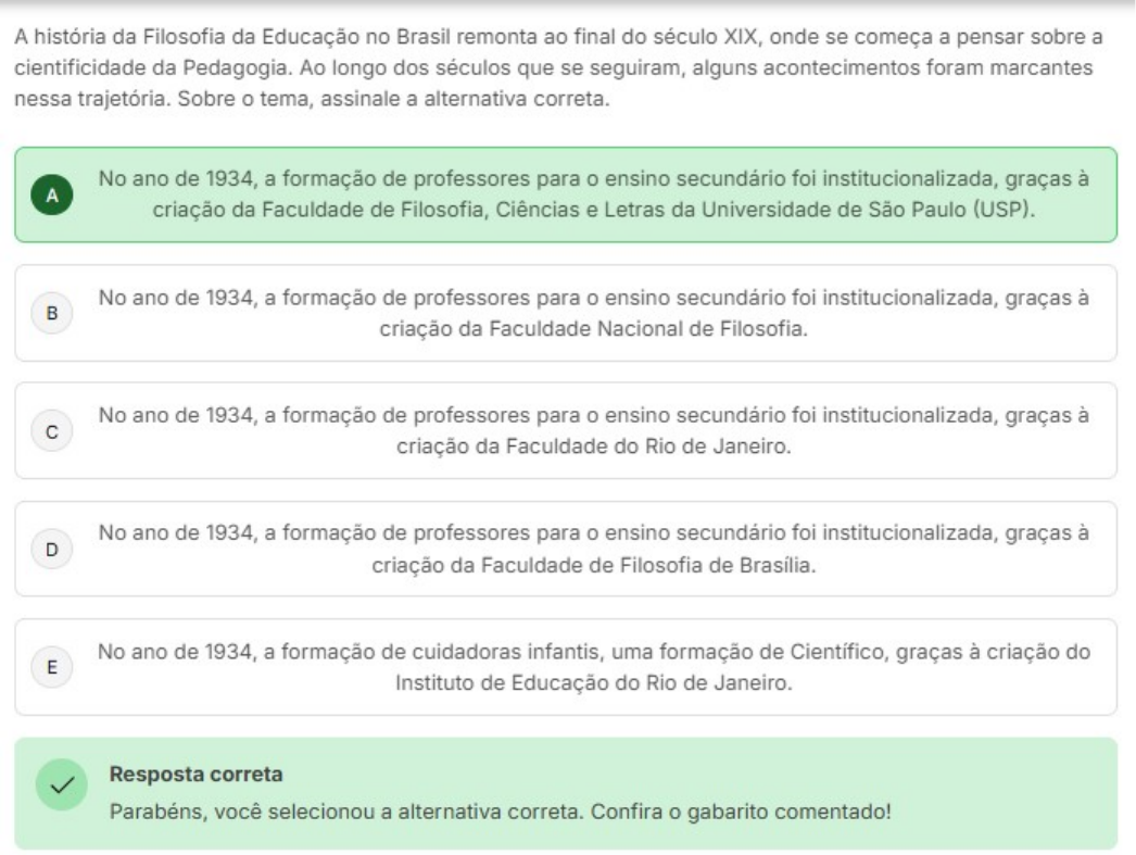 A história da Filosofia da Educação no Brasil remonta ao final do século XIX, onde se começa a pensar sobre a cientificidade da Pedagogia. Ao longo dos séculos que se seguiram, alguns acontecimentos foram marcantes nessa trajetória. Sobre 0 tema, assinale a alternativa correta. No ano de 1934, a formação de professores para ensino secundário foi institucionalizada, graças à A criação da Faculdade de Filosofia, Ciências e Letras da Universidade de São Paulo (USP). No ano de 1934, a formação de professores para ensino secundário foi institucionalizada, graças à criação da Faculdade Nacional de Filosofia. No ano de 1934, a formação de professores para o ensino secundário foi institucionalizada, graças à C criação da Faculdade do Rio de Janeiro. No ano de 1934, a formação de professores para ensino secundário foi institucionalizada, graças à D criação da Faculdade de Filosofia de Brasília. No ano de 1934, a formação de cuidadoras infantis, uma formação de Científico, graças à criação do E Instituto de Educação do Rio de Janeiro. Resposta correta Parabéns, você selecionou a alternativa correta. Confira gabarito comentado!