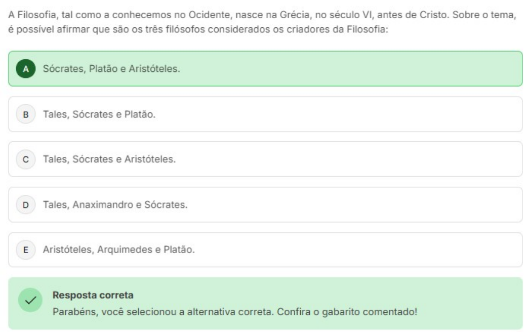 A Filosofia, tal como a conhecemos no Ocidente, nasce na Grécia, no século VI, antes de Cristo. Sobre tema, é possível afirmar que são os três filósofos considerados os criadores da Filosofia: A Sócrates, Platão e Aristóteles. B Tales, Sócrates e Platão. C Tales, Sócrates e Aristóteles. D Tales, Anaximandro e Sócrates. E Aristóteles, Arquimedes e Platão. Resposta correta Parabéns, você selecionou a alternativa correta. Confira o gabarito comentado!
