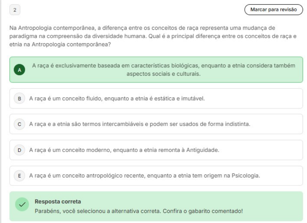 2 Marcar para revisão Na Antropologia contemporânea, a diferença entre os conceitos de raça representa uma mudança de paradigma na compreensão da diversidade humana. Qual é a principal diferença entre os conceitos de raça e etnia na Antropologia contemporânea? A raça é exclusivamente baseada em características biológicas, enquanto a etnia considera também A aspectos sociais e culturais. B A raça é um conceito fluido, enquanto a etnia é estática e imutável. A raça e a etnia são termos intercambiáveis e podem ser usados de forma indistinta. D A raça é um conceito moderno, enquanto a etnia remonta à Antiguidade. E A raça é um conceito antropológico recente, enquanto a etnia tem origem na Psicologia. Resposta correta Parabéns, você selecionou a alternativa correta. Confira gabarito comentado!