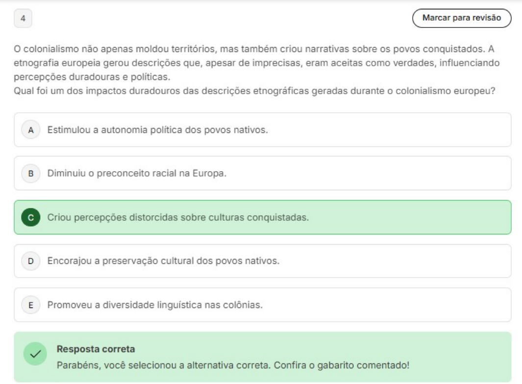 4 Marcar para revisão 0 colonialismo não apenas moldou territórios, mas também criou narrativas sobre os povos conquistados. A etnografia europeia gerou descrições que, apesar de imprecisas, eram aceitas como verdades, influenciando percepções duradouras e políticas. Qual foi um dos impactos duradouros das descrições etnográficas geradas durante colonialismo europeu? A Estimulou a autonomia política dos povos nativos. Diminuiu preconceito racial na Europa. Criou percepções distorcidas sobre culturas conquistadas. D Encorajou a preservação cultural dos povos nativos. E Promoveu a diversidade linguística nas colônias. Resposta correta Parabéns, você selecionou a alternativa correta. Confira gabarito comentado!