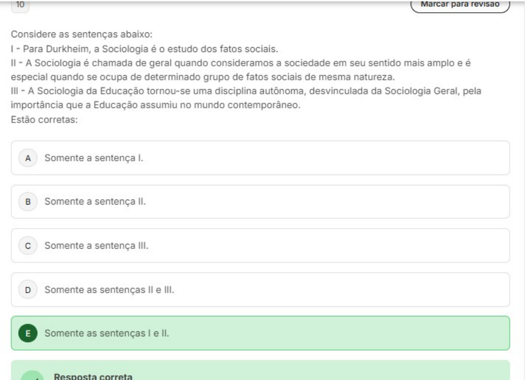 10 Marcar para revisao Considere as sentenças abaixo: Para Durkheim, a Sociologia é 0 estudo dos fatos sociais. A Sociologia é chamada de geral quando consideramos a sociedade em seu sentido mais amplo e é especial quando se ocupa de determinado grupo de fatos sociais de mesma natureza. III A Sociologia da Educação tornou-se uma disciplina autônoma, desvinculada da Sociologia Geral, pela importância que a Educação assumiu no mundo contemporâneo. Estão corretas: A Somente a sentença Somente a sentença II. C Somente a sentença III. D Somente as sentenças e III. E Somente as sentenças e II. Resposta correta