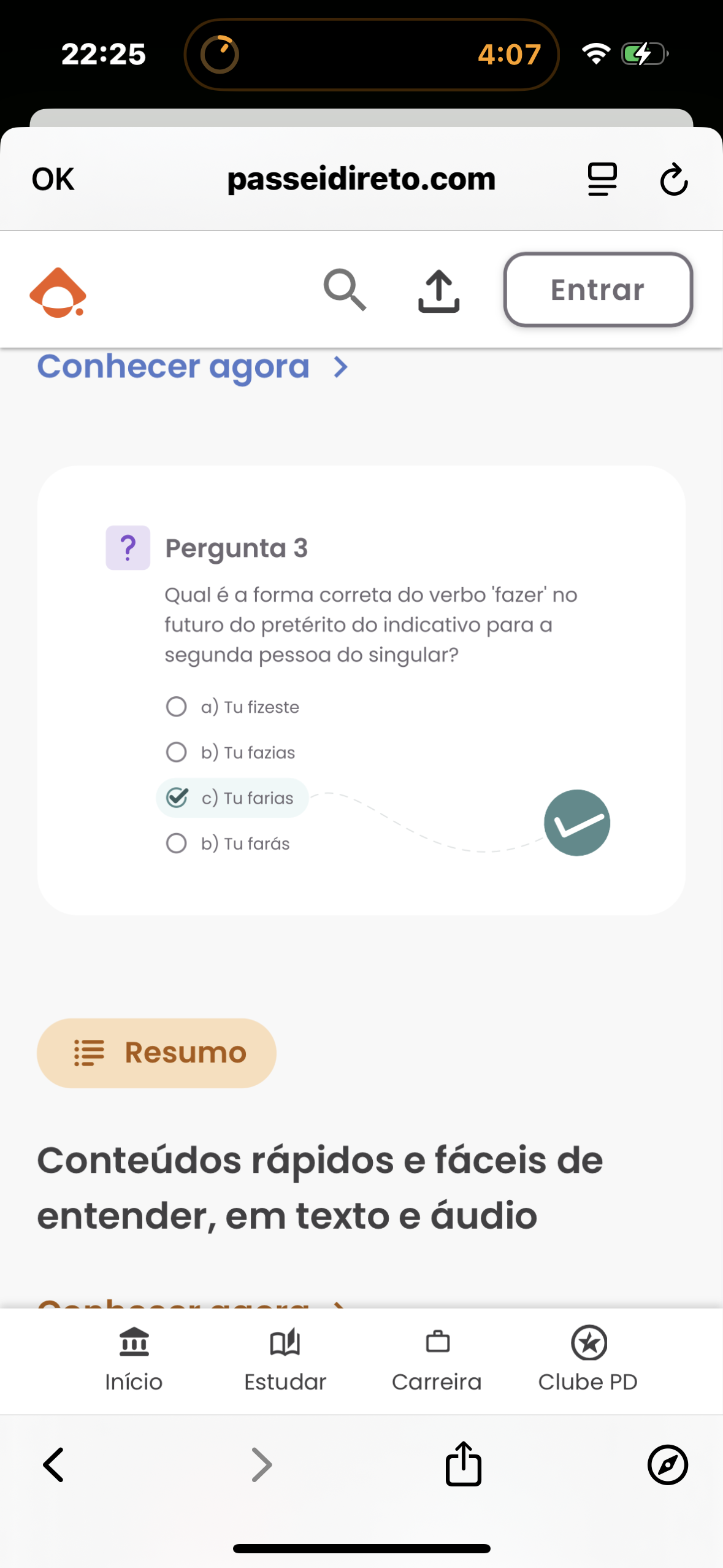 22:25 4:07 4 OK passeidireto.com Oli Entrar Conhecer agora > ? Pergunta 3 Qual é a forma correta do verbo 'fazer' no futuro do pretérito do indicativo para a segunda pessoa do singular? a) Tu fizeste b) Tu fazias c) Tu farias b) Tu farás Resumo Conteúdos rápidos e fáceis de entender, em texto e áudio Início Estudar Carreira Clube PD