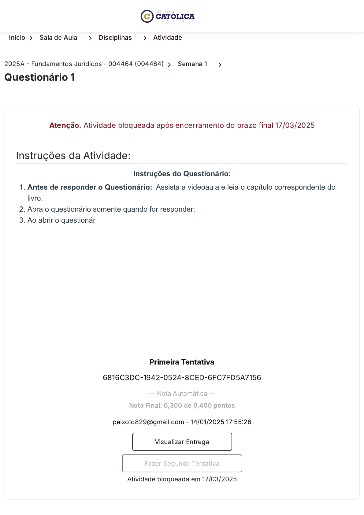 Início 〉 Sala de Aula 〉 Disciplinas 〉 Atividade 2025A - Fundamentos Jurídicos - 004464 (004464) 〉 Semana 1 〉 Questionário 1 Instruções da Atividade: Atenção. Atividade bloqueada após encerramento do prazo final 17/03/2025 Instruções do Questionário: 1. Antes de responder o Questionário: Assista a videoaula e leia o capítulo correspondente do livro. 2. Abra o questionário somente quando for responder; 3. Ao abrir o questionário você terá 4 questões para responder; 4. Leia com calma todas as questões e entenda o que pede a questão: se pede a incorreta, a correta e qual o tema da questão; 5. Lembre-se de Clicar no botão "Enviar"; 6. Você tem duas tentativas para fazer o teste, a segunda tentativa é opcional; 7. Lembre-se que as respostas mudam de lugar em cada tentativa; 8. As respostas corretas só aparecem após o envio da segunda tentativa; 9. O sistema considera a maior nota entre as duas tentativas; 10. Lembre-se que na segunda tentativa zera TODAS as questões, inclusive as que você acertou na primeira tentativa. Bons estudos! Primeira Tentativa 6816C3DC-1942-0524-8CED-6FC7FD5A7156 -- Nota Automática -- Nota Final: 0,300 de 0,400 pontos peixoto829@gmail.com - 14/01/2025 17:55:26 Visualizar Entrega Atividade bloqueada em 17/03/2025 Fazer Segunda Tentativa https://ava.uca.edu.br/aluno/sala-de-aula/disciplina/modulo/atividade/312113 https://ava.uca.edu.br/aluno/sala-de-aula/disciplina/modulo/atividade/312113 https://ava.uca.edu.br/aluno/sala-de-aula/disciplina https://ava.uca.edu.br/aluno/sala-de-aula/disciplina/modulo/atividade/:id/:nome javascript:void(0); Perguntas Pergunta 1. Pergunta 2. Pergunta 3. Pergunta 4. pontos: 0,100Pergunta 1. A característica principal do Direito do Trabalho: Múltipla Escolha: A. proteção ao empregador B. proteção ao empregador e ao consumidor C. proteção ao consumidor D. proteção ao trabalhador E. proteção ao trabalhador e ao empregador Avaliação Nota Avaliada: 0,000 de 0,100 javascript:void(0); pontos: 0,100Pergunta 2. Licitação é um processo administrativo para escolher a proposta: Múltipla Escolha: A. mais barata para o Poder Público B. mais vantajosa para o Poder Público C. mais conveniente para o Poder Público D. mais justa para a sociedade E. mais igualitária para a sociedade pontos: 0,100Pergunta 3. Avaliação Nota Avaliada: 0,100 de 0,100 javascript:void(0); Entre as alternativas, qual é a que tem a finalidade específica dos certames licitatórios: Múltipla Escolha: A. escolher a melhor proposta, mesmo que não seja a mais barata, permitir a igualdade entre os participantes e auxiliar no desenvolvimento nacional. B. escolher a melhor proposta, mesmo que não seja a mais barata, permitir a igualdade entre os participantes e auxiliar somente no desenvolvimento estadual. C. escolher a proposta mais barata, sempre, permitir a igualdade entre os participantes e auxiliar no desenvolvimento nacional. D. escolher a melhor proposta, mesmo que não seja a mais barata, permitir a igualdade entre os participantes e auxiliar somente no desenvolvimento municipal. E. escolher a pior proposta, mesmo que não seja a mais barata, permitir a igualdade entre os participantes e auxiliar no desenvolvimento nacional. pontos: 0,100Pergunta 4. São princípios base de toda Administração Publica, exceto: Múltipla Escolha: Avaliação Nota Avaliada: 0,100 de 0,100 javascript:void(0); A. impessoalidade B. autotutela C. legalidade D. publicidade E. moralidade Fechar Visualização 〈 Voltar aos Módulos 〈 Anterior Avaliação Nota Avaliada: 0,100 de 0,100 Próxima 〉 javascript:void(0); Faculdade Católica Paulista Contato Endereço Avenida Cristo Rei, 305 – Banzato Marília, São Paulo – CEP: 17515-200 Horário De Funcionamento Segunda a quinta, das 8:00 às 20:00 horas As sextas, das 8:00 às 18:00 horas. WhatsApp : (14) 9.8826-3000 Telefone Sede: (14) 3422-1815 Central de Atendimento: 0800 664 5583 E-mail : secretaria@uca.edu.br https://www.instagram.com/faculdadecatolicaead/ https://facebook.com/ucaead https://www.youtube.com/@UcaEduBr https://www.linkedin.com/school/faculdade-catolica-paulista/?originalSubdomain=br https://maps.app.goo.gl/wWsD9QX5fVPa3h6PA https://api.whatsapp.com/send?phone=5514988263000&text=Suporte tel:14-3422-1815 tel:14-3422-1815 tel:0800-664-5583 tel:0800-664-5583 mailto:secretaria@uca.edu.br javascript:void(0);