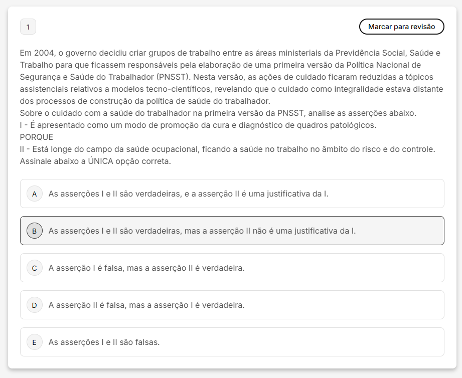 1 Marcar para revisão Em 2004, O governo decidiu criar grupos de trabalho entre as áreas ministeriais da Previdência Social, Saúde e Trabalho para que ficassem responsáveis pela elaboração de uma primeira versão da Nacional de Segurança e Saúde do Trabalhador (PNSST). Nesta versão, as ações de cuidado ficaram reduzidas a tópicos assistenciais relativos a modelos tecno-cientificos, revelando que O cuidado como integralidade estava distante dos processos de construção da política de saúde do trabalhador. Sobre cuidado com a saúde do trabalhador na primeira versão da PNSST, analise as asserções abaixo. I É apresentado como um modo de promoção da cura e diagnóstico de quadros patológicos. PORQUE Está longe do campo da saúde ocupacional, ficando a saúde no trabalho no âmbito do risco e do controle. Assinale abaixo a ÚNICA opção correta. A As asserções I e II são verdadeiras, e a asserção é uma justificativa da I. B As asserções I e são verdadeiras, mas a asserção não é uma justificativa da I. C A asserção I é falsa, mas a asserção é verdadeira. D A asserção II é falsa, mas a asserção I é verdadeira. E As asserções I e são falsas.