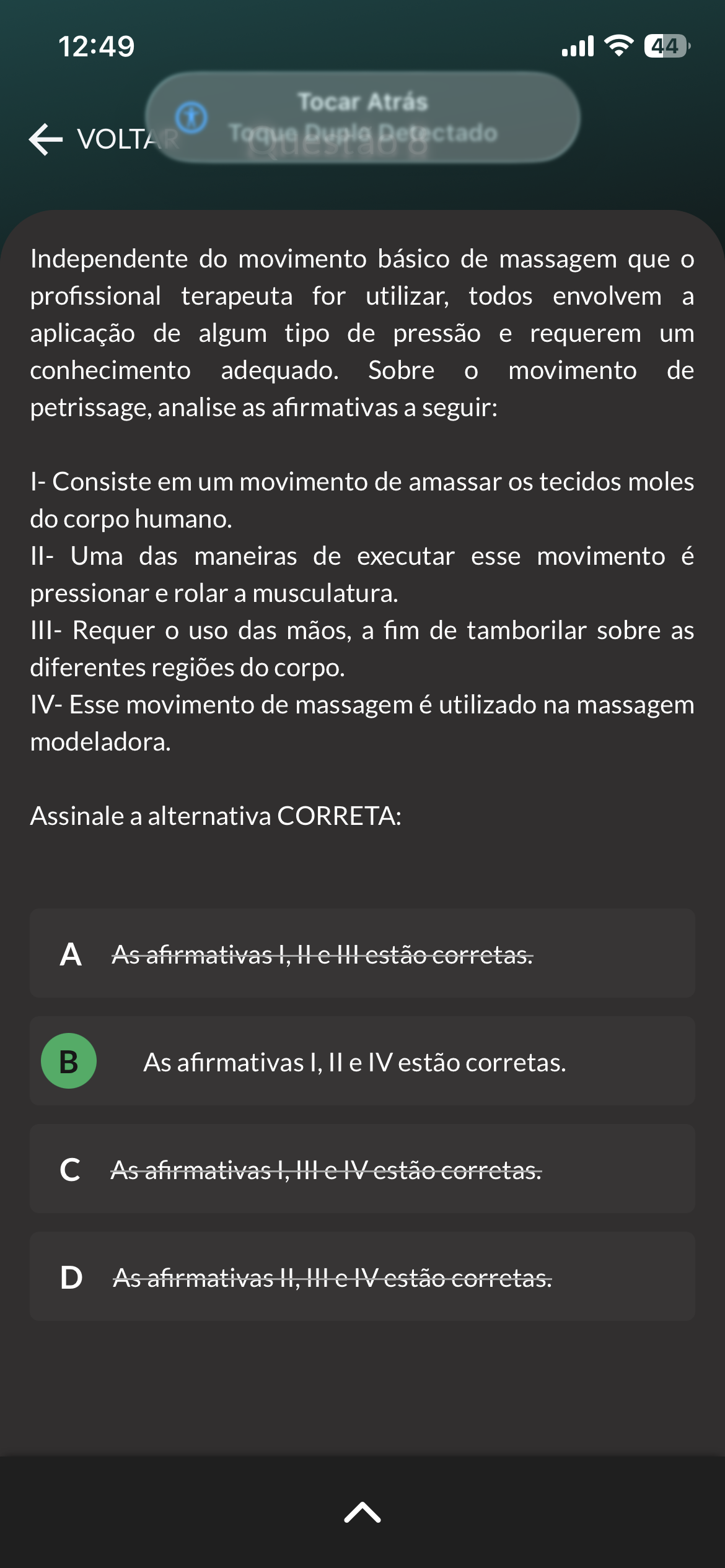 12:49 44 Tocar Atrás VOLTA Toque Detectado Independente do movimento básico de massagem que o profissional terapeuta for utilizar, todos envolvem a aplicação de algum tipo de pressão e requerem um conhecimento adequado. Sobre movimento de petrissage, analise as afirmativas a seguir: I- Consiste em um movimento de amassar os tecidos moles do corpo humano. II- Uma das maneiras de executar esse movimento é pressionar e rolar a musculatura. III- Requer uso das mãos, a fim de tamborilar sobre as diferentes regiões do corpo. IV- Esse movimento de massagem é utilizado na massagem modeladora. Assinale a alternativa CORRETA: A As afirmativas I, III estão corretas. B As afirmativas I, e IV estão corretas. c As afirmativas I, e IV estão corretas. D As afirmativas III e IV estão corretas.