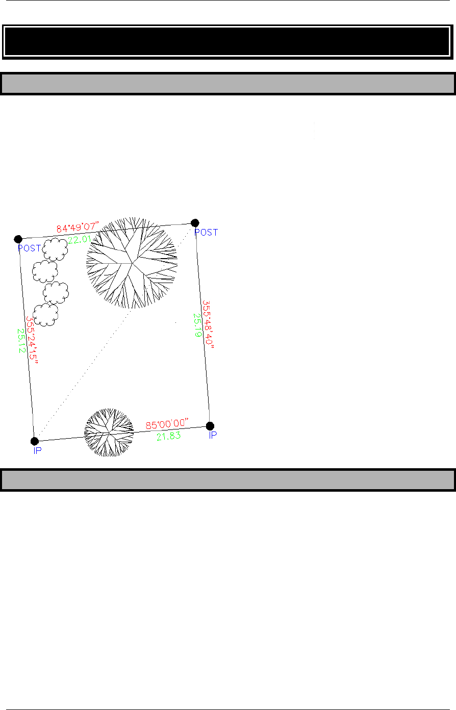 FieldGenius 2008 v3.2.0 Tutorial 2 Tutorial 2: Measuring a Lot Introduction In this tutorial, we will be using the manual input mode to simulate shooting a property. The figure below illustrates the property that you will be picking up. Although there are some trees on the lot, in this tutorial we are only interested in locating the four lot corners and then rotating our new points so they match the plan azimuths. We will assume that iron pins have been found at the site and look to be in satisfactory condition. An assumed coordinate will be used for the SW corner of the lot, and our initial backsight will be to the NW corner. Starting the Job Start FieldGenius by double tapping the FieldGenius icon. Depending on your data collector it will be on the Desktop or in the Start > Programs menu. © 2005-2007 MicroSurvey Software Inc. Page 1 of 15 FieldGenius 2008 v3.2.0 Tutorial 2 On the FieldGenius Project Manager screen, press New Project to create a new project. Name the project “TUTORIAL 2 LOT” and press OK. On the Project Review screen, press the Modify Project Information button. Enter your project information then press OK to return to the Review Project screen, and then press Continue. © 2005-2007 MicroSurvey Software Inc. Page 2 of 15 FieldGenius 2008 v3.2.0 Tutorial 2 Set the project defaults as shown. Select Meters (3 decimals precision), Degrees (DDD-MM-SS.s with 1 decimal precision), and North Azimuth then press OK. You will be asked if you would like to define a coordinate system. Choose No. Occupying a Setup Point On the Instrument Selection screen, select Total Station Demo then press Connect. Typically you would select Total Station, and have FieldGenius communicate directly with your instrument, but for the sake of this tutorial we will use the Total Station Demo mode rather than connecting to an actual instrument. Although we will enter the shot data manually, the manual entries will simulate actual angles and distances being measured with your total station. © 2005-2007 MicroSurvey Software Inc. Page 3 of 15 FieldGenius 2008 v3.2.0 Tutorial 2 You will be asked if you would like to create a new point. Choose Yes. We will begin by assigning an assumed coordinate to point 1. Create point number 1 at 1000,1000,100 with a description IP. Then press the Store Point button. When it asks if you would like to setup at the point, press Yes. We will setup on point 1, and shoot a backsight due north. Set the Occupy Point to 1, and set the Instrument Height to 1.650m. Select Backsight Direction, and set the direction to 0 degrees. Then press the Target Height button. © 2005-2007 MicroSurvey Software Inc. Page 4 of 15 FieldGenius 2008 v3.2.0 Tutorial 2 Set the Target Height for IR EDM to 2m, and then press OK to return to the Occupy Point screen. Press the Observe Backsight button to return to the Map Screen. The measurement mode button “BS Ang/Dist” indicates that we will be taking an Angle and Distance shot to the backsight. In other situations, if you want to shoot the backsight by angles only, press the measurement mode button to choose Angles Only instead of Angles & Distance. From the map screen, press the Measure button (or your Enter key) to take the shot. Normally this will trigger your instrument to take a measurement, but because you are in Manual mode it will prompt you to enter the angles and distance manually. Enter a Horizontal angle of 0, a vertical angle of 89.12345 and a slope distance of 25.123. Then press OK. © 2005-2007 MicroSurvey Software Inc. Page 5 of 15 FieldGenius 2008 v3.2.0 Tutorial 2 It will now let you review your backsight information. Ensure that your HI and HT were set correctly. When connected with your total station, you may be able to choose a Plate Setting option to zero your instrument onto the backsight point if your total station supports this ability. Press Accept. When it asks if you would like to store the measured backsight point, press Yes. It will now ask for the point ID and description for the backsight point we just shot. Give it an ID of 2, and a Description of POST. Note, you can not change the coordinates of a measured point. Then press Store Point. Select Yes if you are asked if you want to add the description POST to your project automap library. You will then be taken back to the map screen. Press the Zoom Extents button to see the entire job so far. Because we have completed the setup process, you will now see an instrument icon displayed on the setup point (1) and a prism pole icon displayed on the backsight point (2). © 2005-2007 MicroSurvey Software Inc. Page 6 of 15 FieldGenius 2008 v3.2.0 Tutorial 2 Measuring the Site (Traversing and Sideshots) Because we do not have a clear shot to the other two property corners, we will have to traverse to a new location where we can shoot them. To do this we will need to ensure that we have the measurement mode set to “Sideshot”. If it says “Sideshot (Auto)” then press the measurement mode button to change it, and then select Sideshot. Depending on your program settings, this may default to either Sideshot or Sideshot Auto. Press the Measure button or your Enter key to take the next shot. Enter the Horizontal Angle 54.32123, Vertical Angle 89.01234, Slope Distance 22.876, and then press OK. © 2005-2007 MicroSurvey Software Inc. Page 7 of 15 FieldGenius 2008 v3.2.0 Tutorial 2 Ensure that Point ID = 3, Target Height = 2m, set the Description= HUB, then press the Store TR button to store this shot as a traverse shot. This leaves us still setup on point 1, backsighting 2. We need to advance to the next setup point 3, backsighting 1. Press the Measurement Mode button (it is the button above the Target Height that currently says “Sideshot” then select Occupy Point. Make sure the Occupy Point is set to 3. Enter the new instrument height at our new setup, 1.7 meters. Select the Backsight Point method, choosing Backsight Point 1. Make sure the Target Height is still 2m. Pr