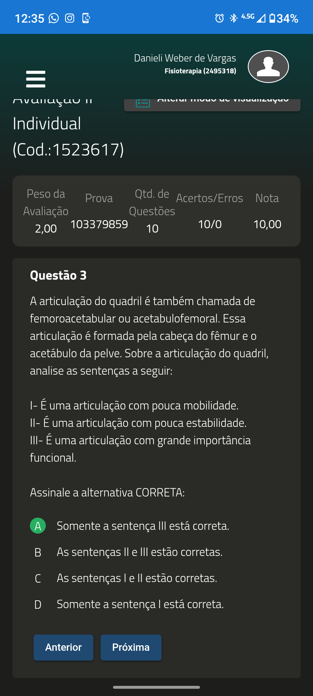 12:35 4.5G 34% Danieli Weber de Vargas Fisioterapia (2495318) II Individual (Cod.: 1523617) Peso da Prova Qtd. de Acertos/Erros Nota Avaliação Questões 2,00 103379859 10 10/0 10,00 Questão 3 articulação do quadril é também chamada de femoroacetabular ou acetabulofemoral. Essa articulação é formada pela cabeça do fêmur e acetábulo da pelve. Sobre a articulação do quadril, analise as sentenças a seguir: É uma articulação com pouca mobilidade. II- É uma articulação com pouca estabilidade. III- É uma articulação com grande importância funcional. Assinale a alternativa CORRETA: A Somente a sentença está correta. B As sentenças e estão corretas. C As sentenças e estão corretas. D Somente a sentença está correta. Anterior Próxima